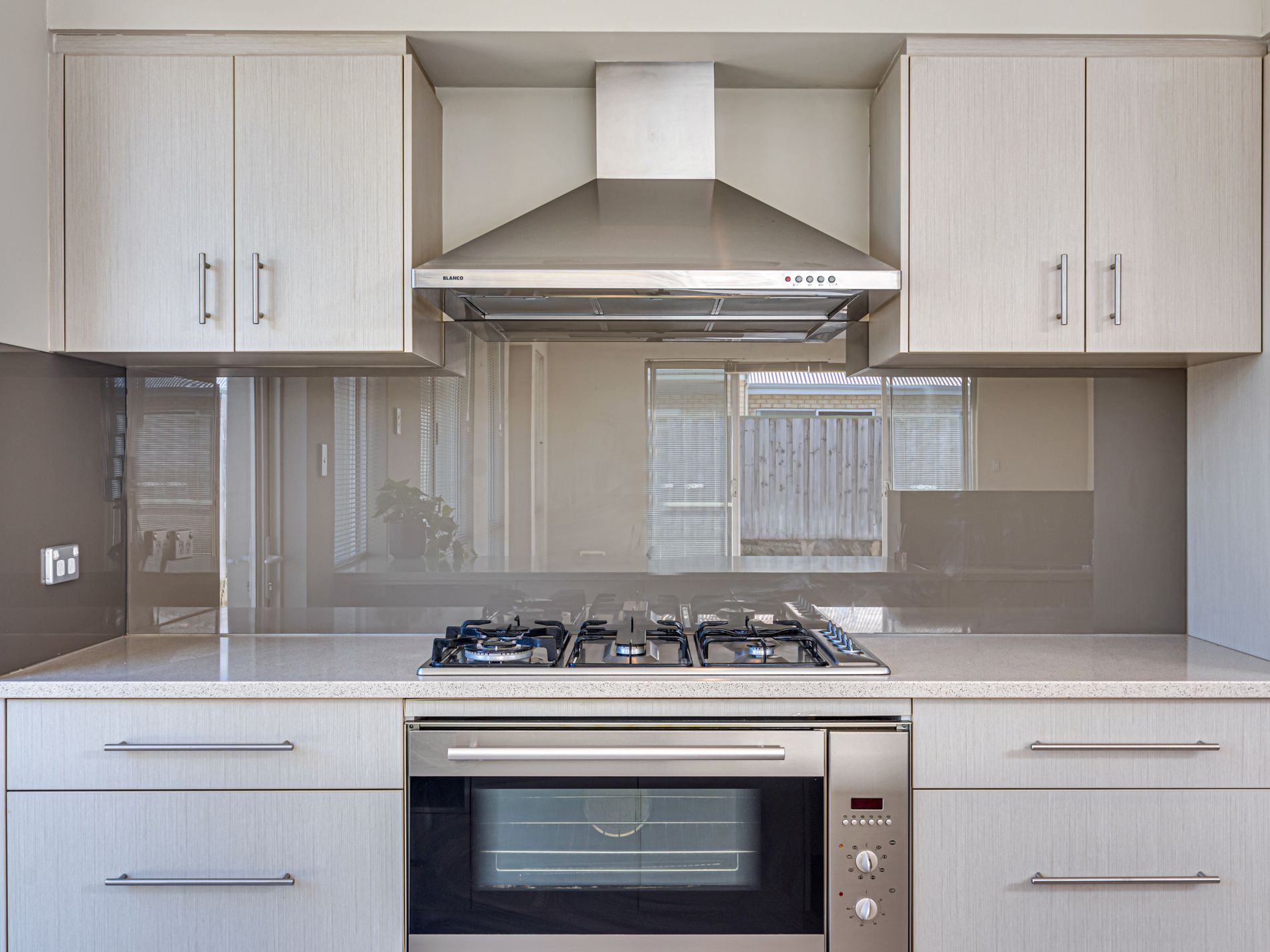 • Kitchen with plenty of bench space, stone benchtops, overhead cupboards, 90cm gas cooktop and under-bench oven, rangehood, double fridge recess and space for a