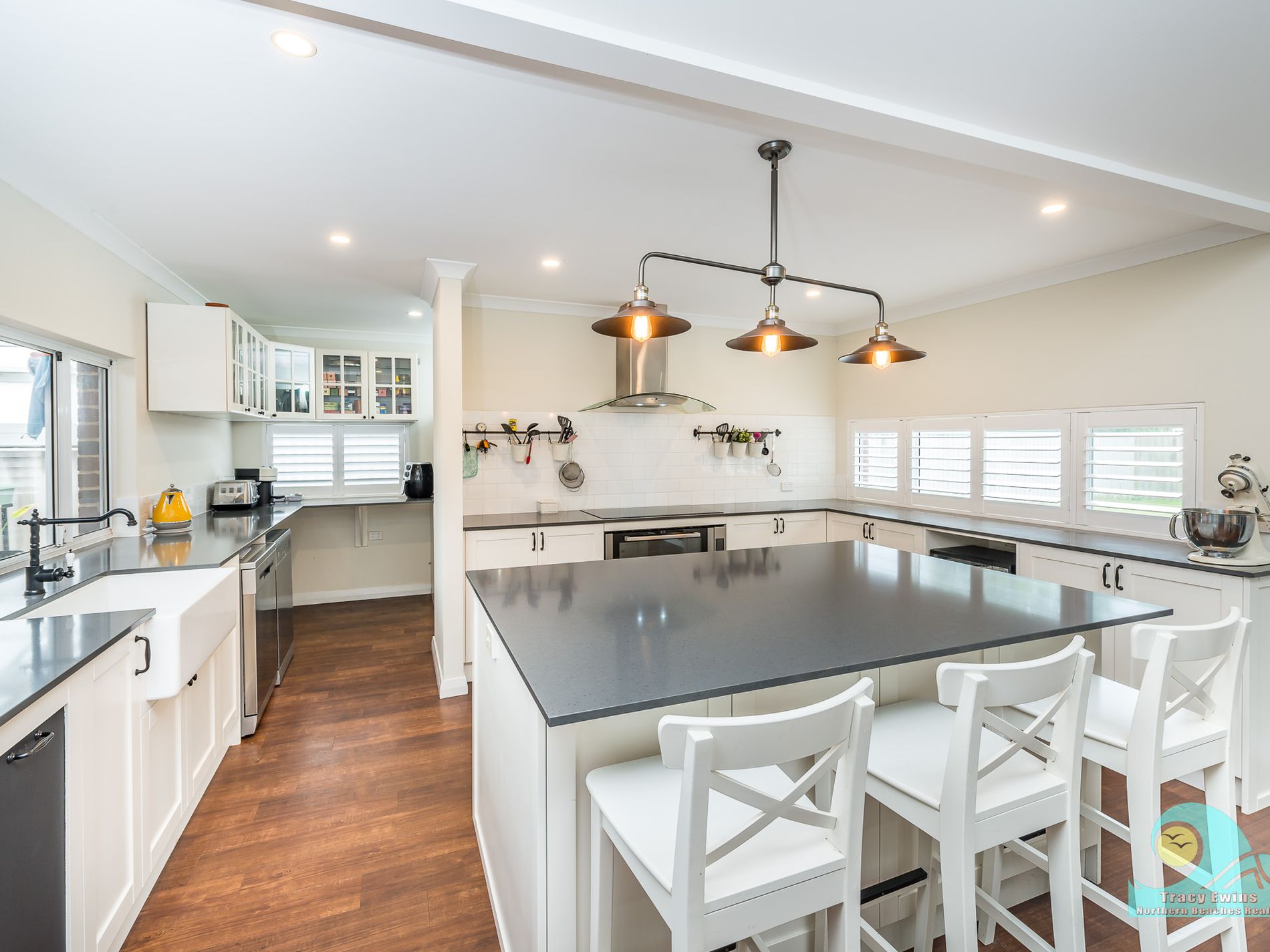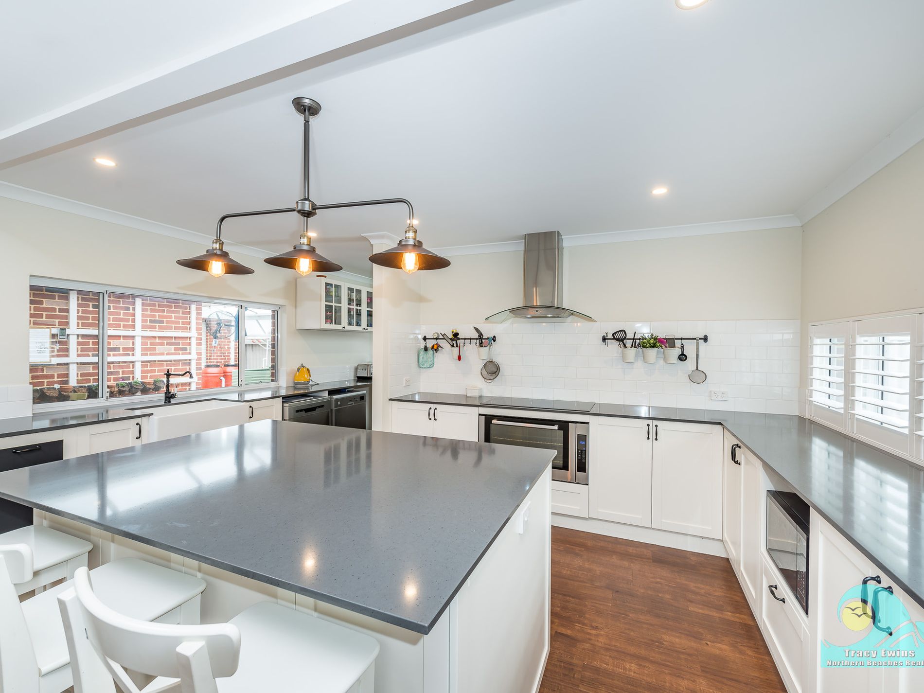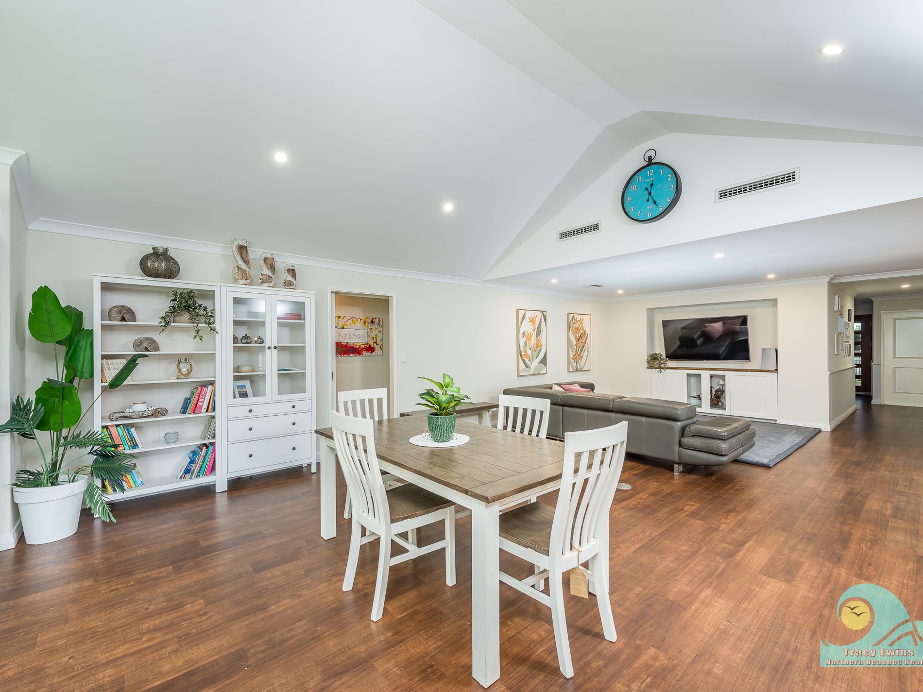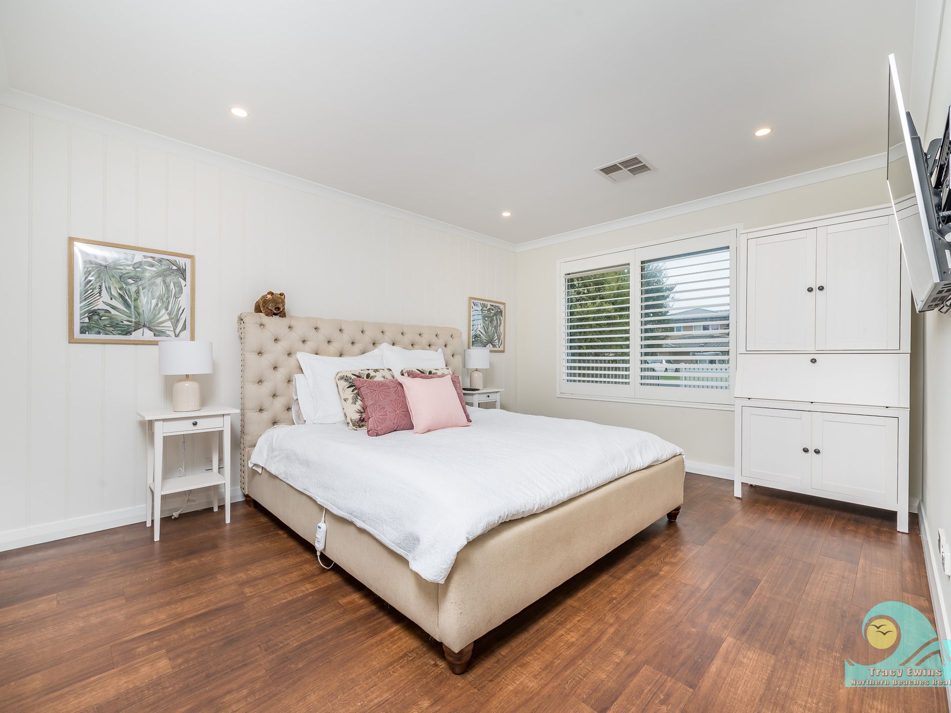 Off the open plan living/kitchen/dining area you step down into the very generous but cosy media/entertainment/theatre room with projector and built-in audio system included and beautiful plantation shutters.