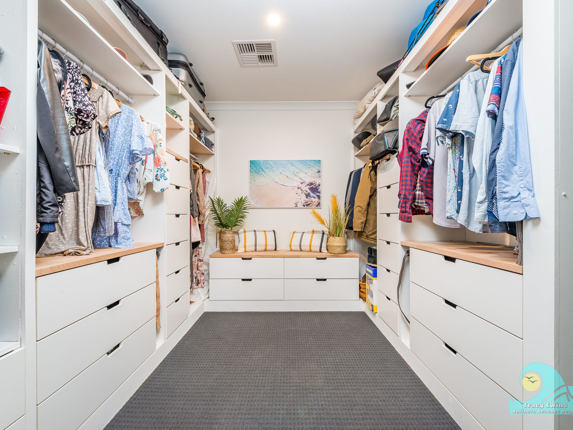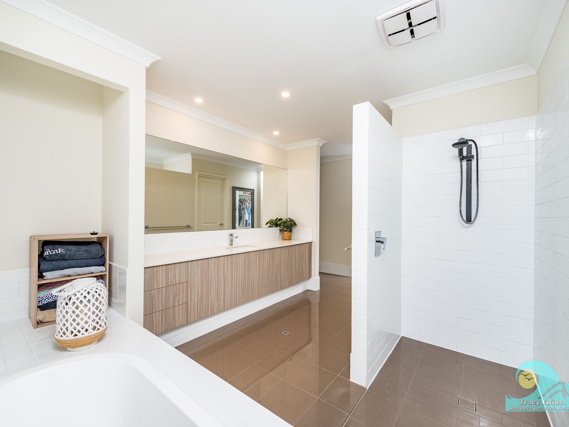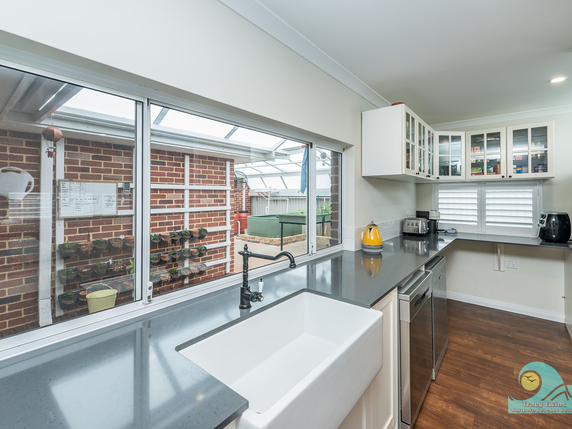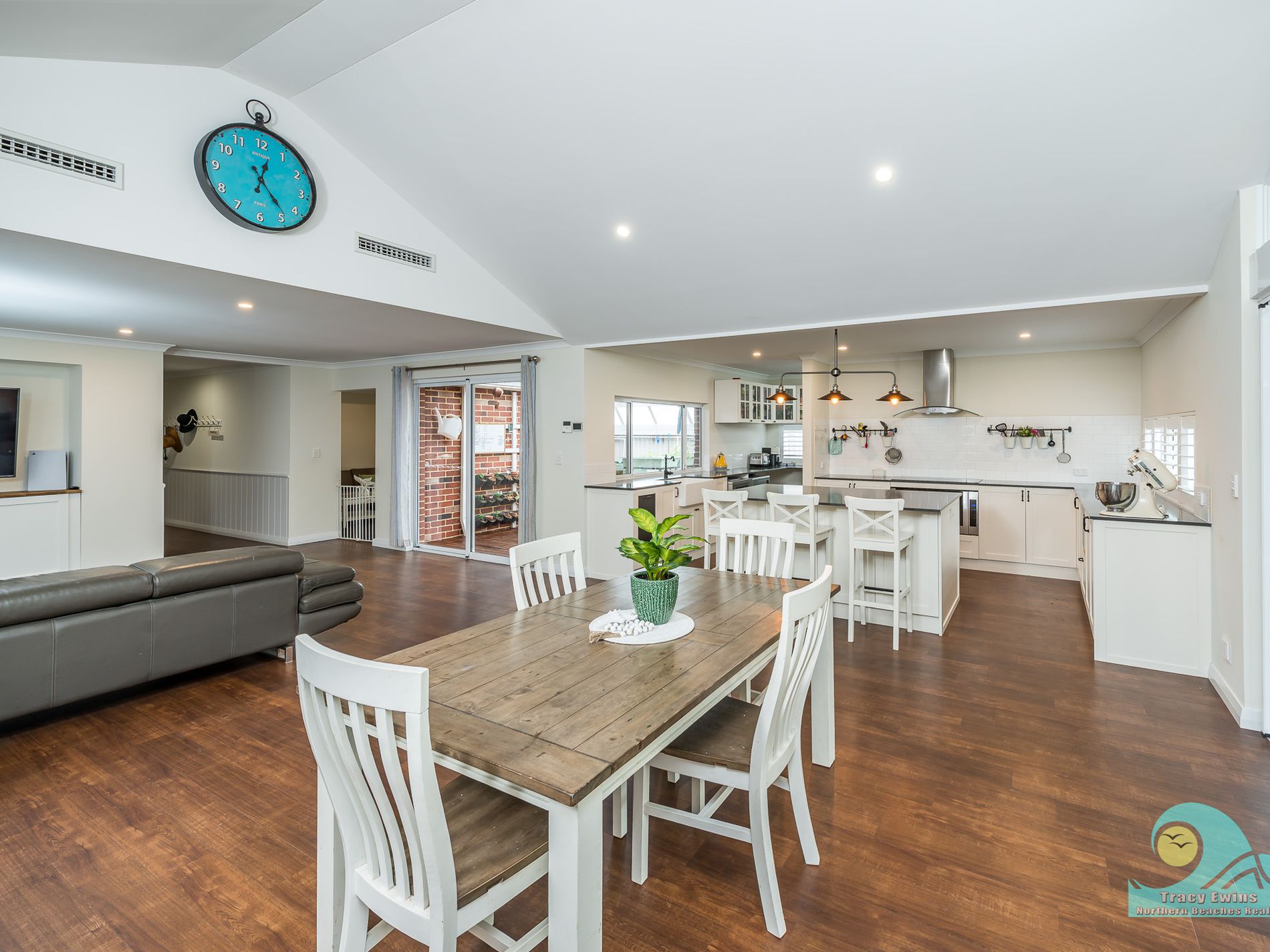 Off the open plan living/kitchen/dining area you step down into the very generous but cosy media/entertainment/theatre room with projector and built-in audio system included and beautiful plantation shutters.