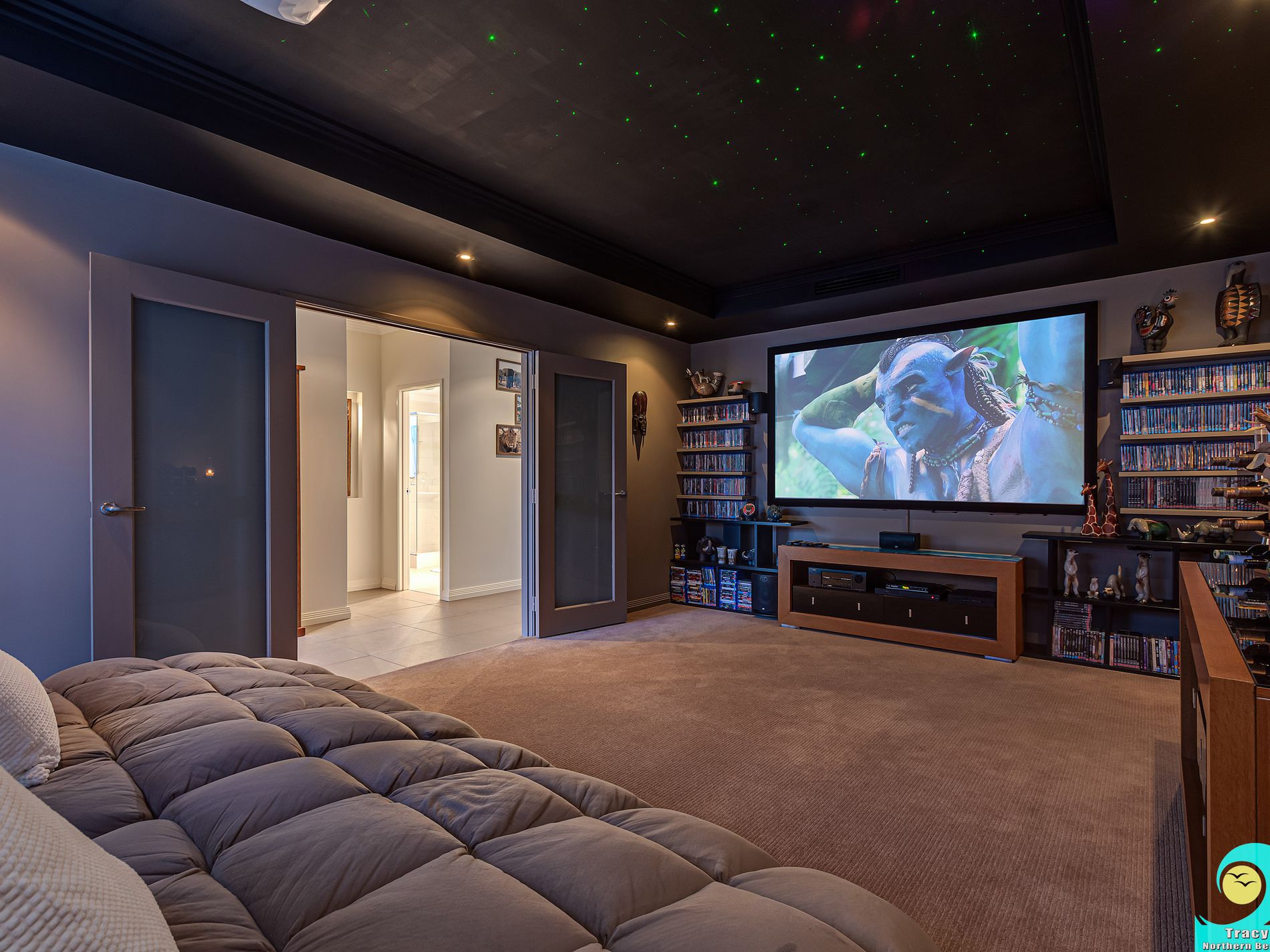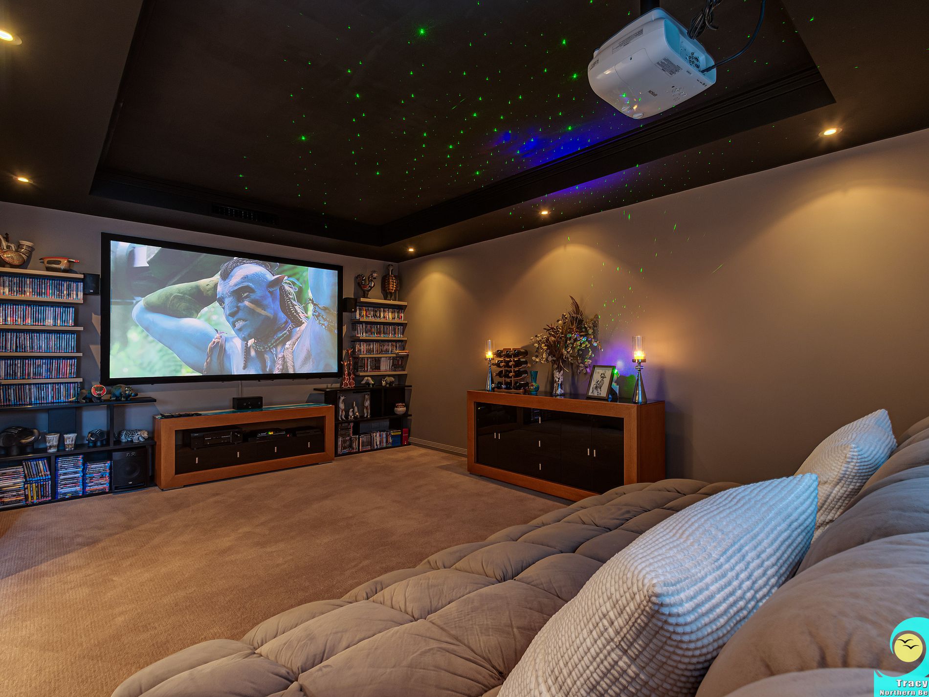 • Fabulous theatre-room with double door entry, (projector and screen included) and décor designed to give you that real ‘Movie Experience’ feel.