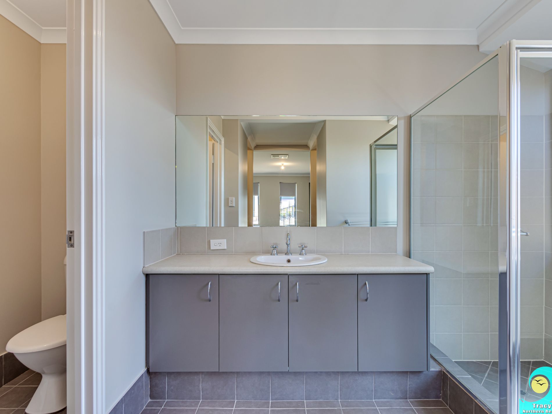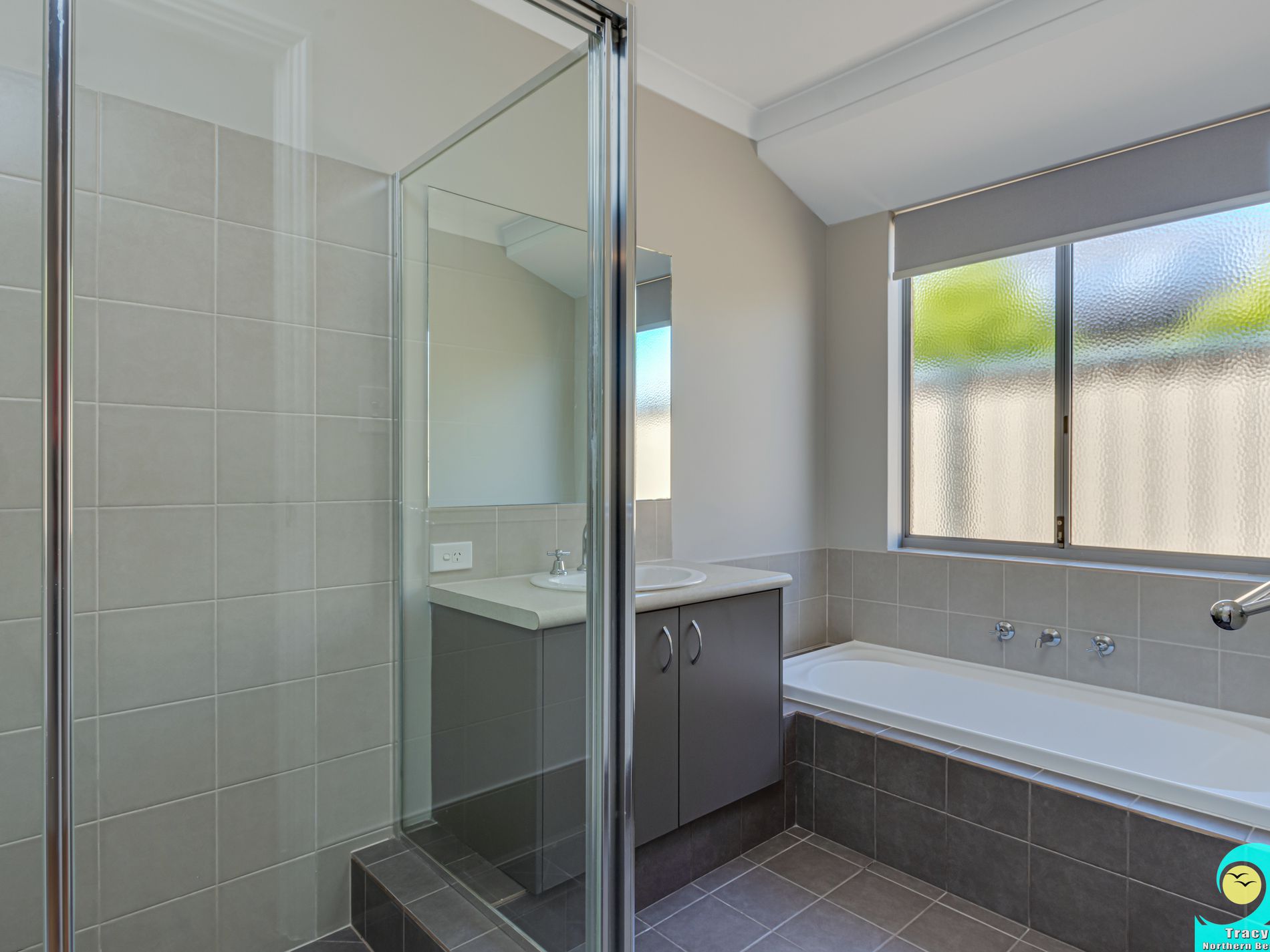 • The main bathroom has a vanity, shower and separate bath.