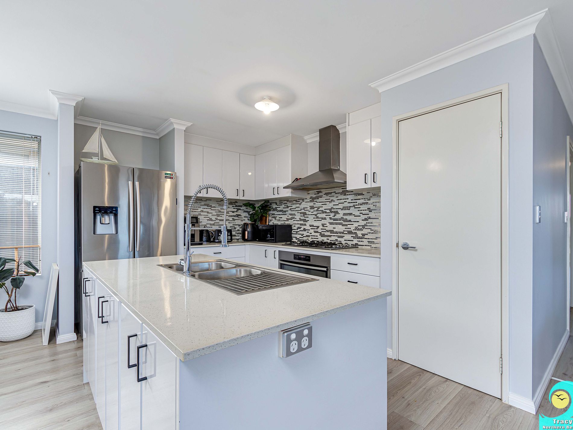 • Modern kitchen with stylish splash back, stone bench tops, dishwasher, 90cm rangehood, 90cm gas cooktop, 90cm oven, double fridge recess, overhead cupboards and kitchen island with cupboards on both sides.