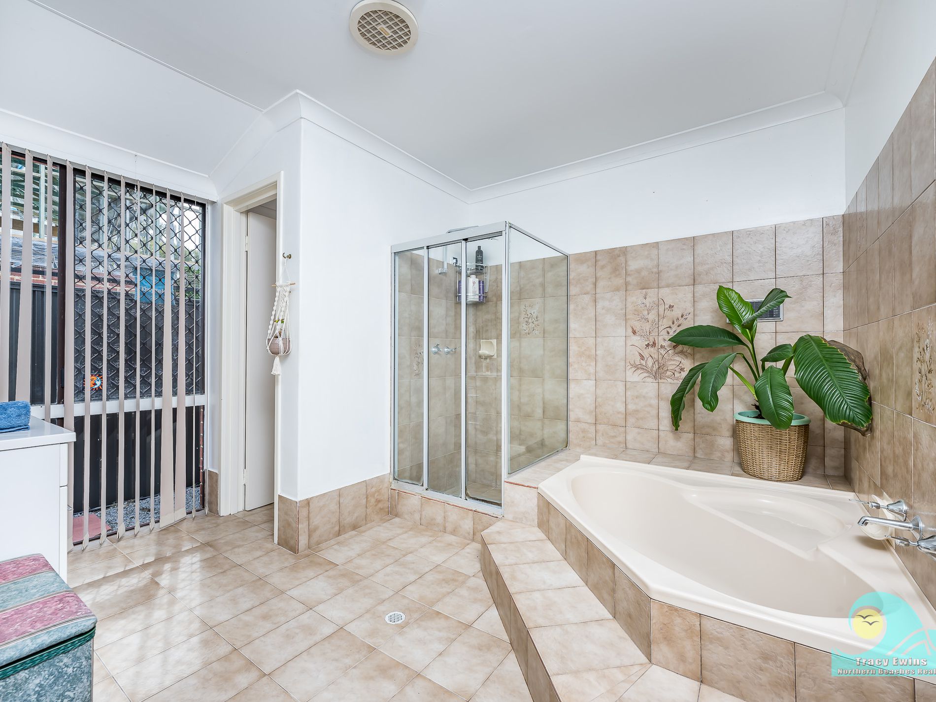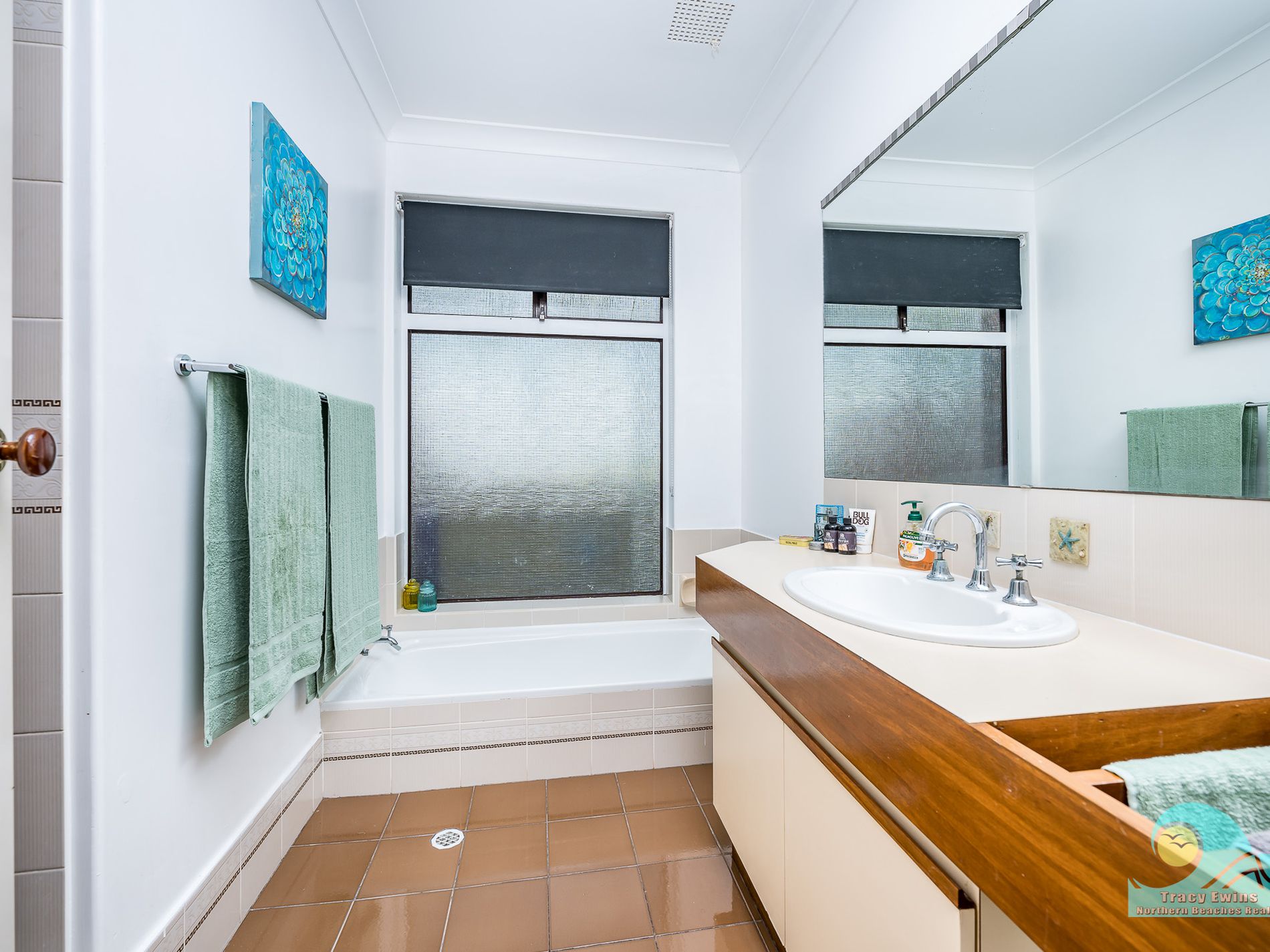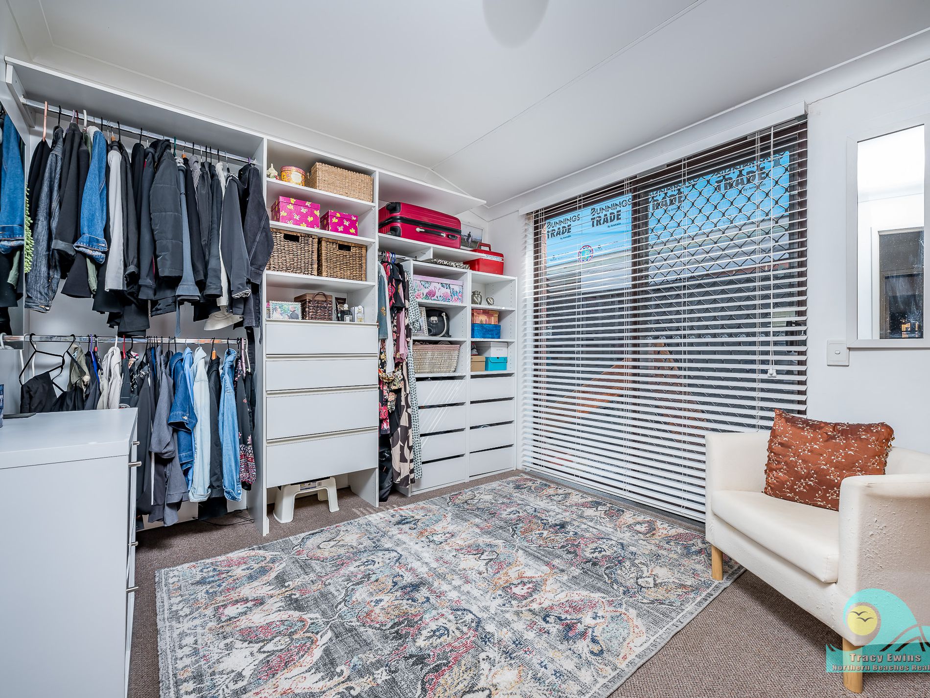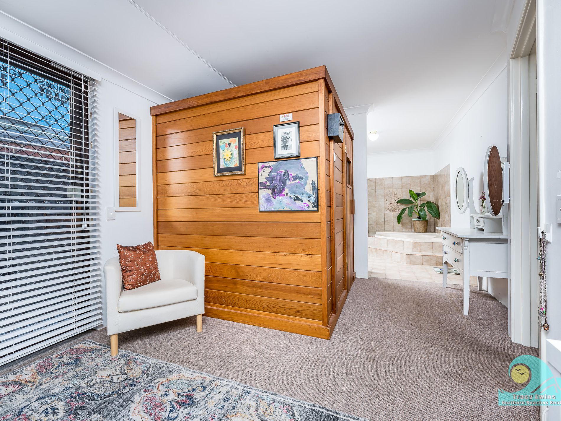 • Master bedroom suite with a split system AC unit, ceiling fan, walk in wardrobe, plus a dressing room with more storage, professionally built timber sauna, ensuite with shower, large corner tub, vanity and separate WC.