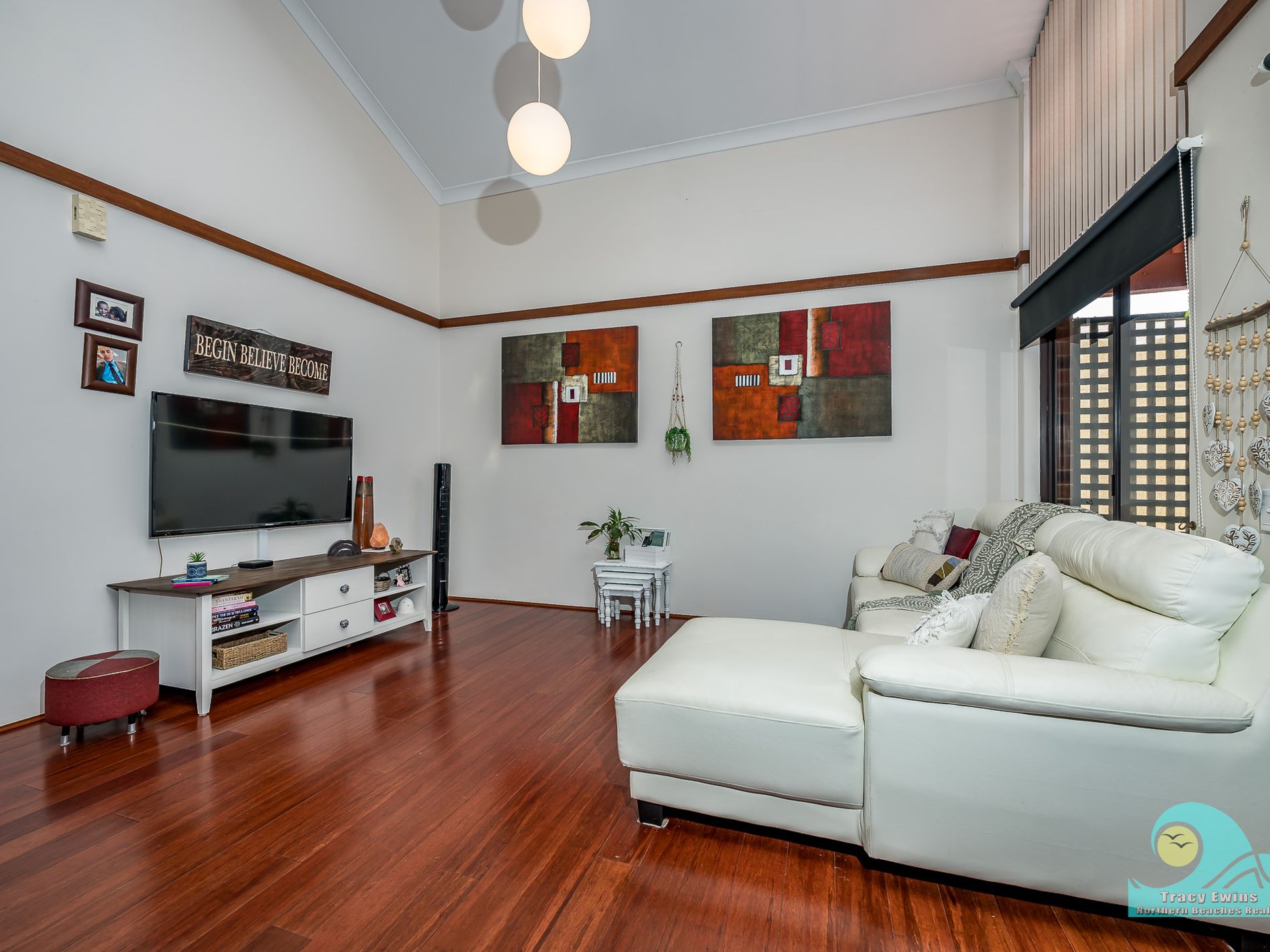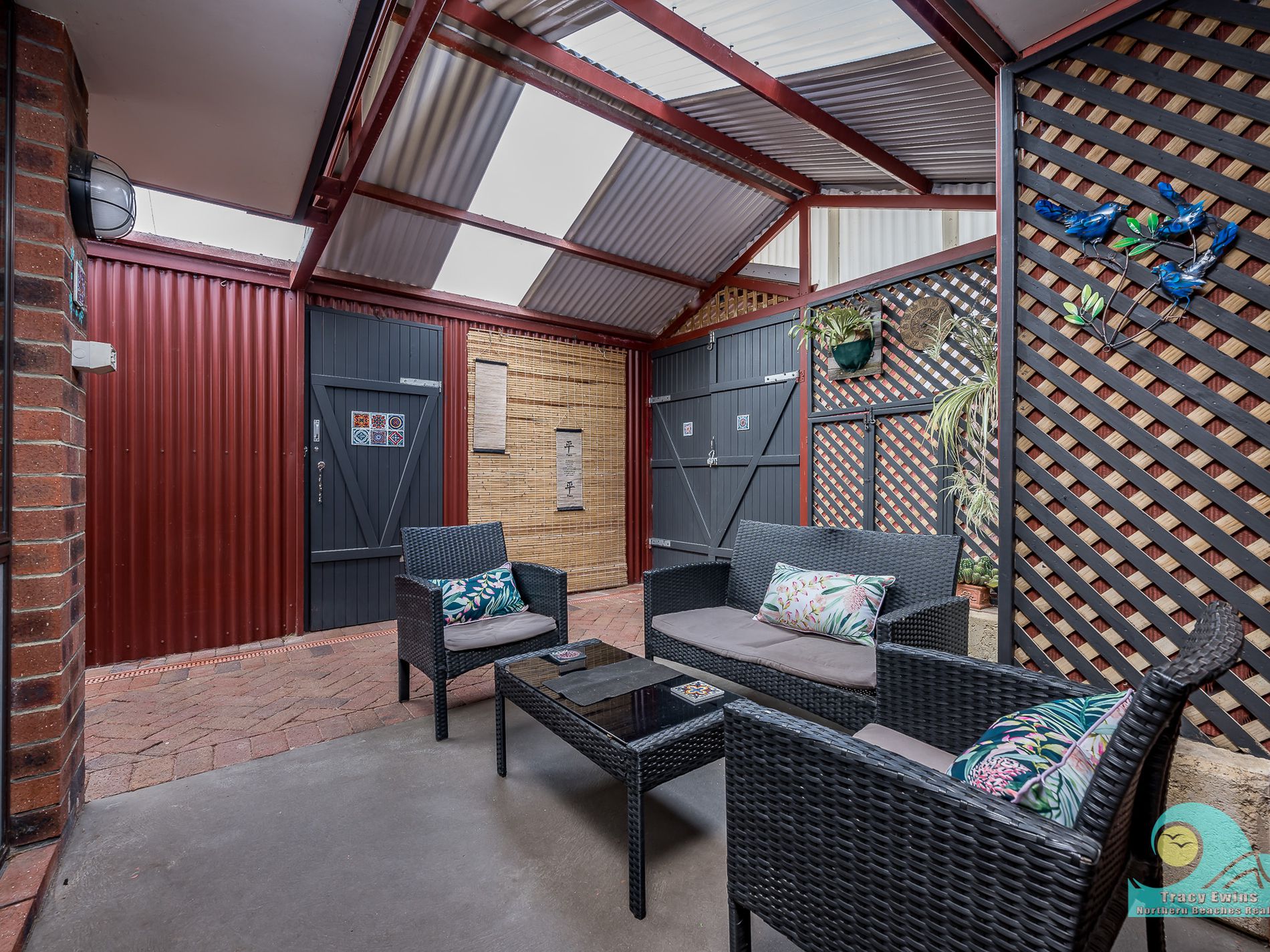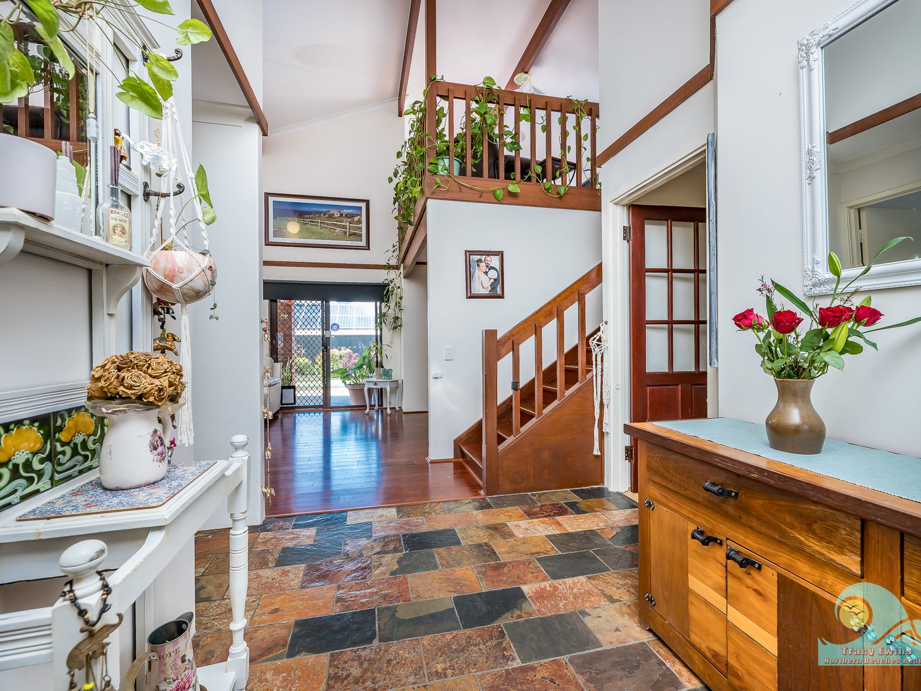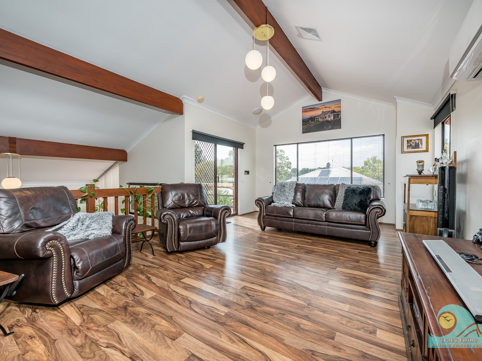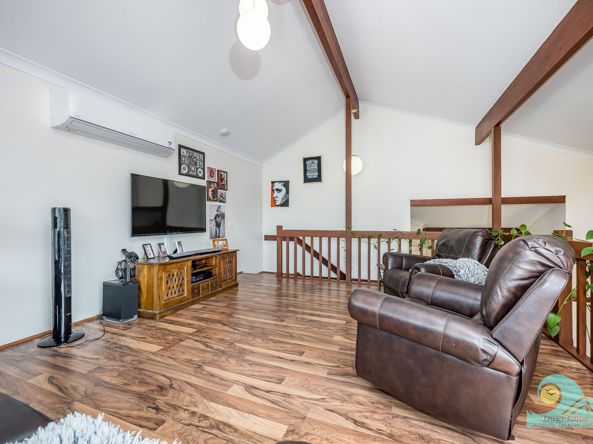 • Downstairs living room and formal dining with high ceilings and exposed beams with stairs leading up to the mezzanine floor with a second living area which has a split system AC unit which cools both upstairs and downstairs.
