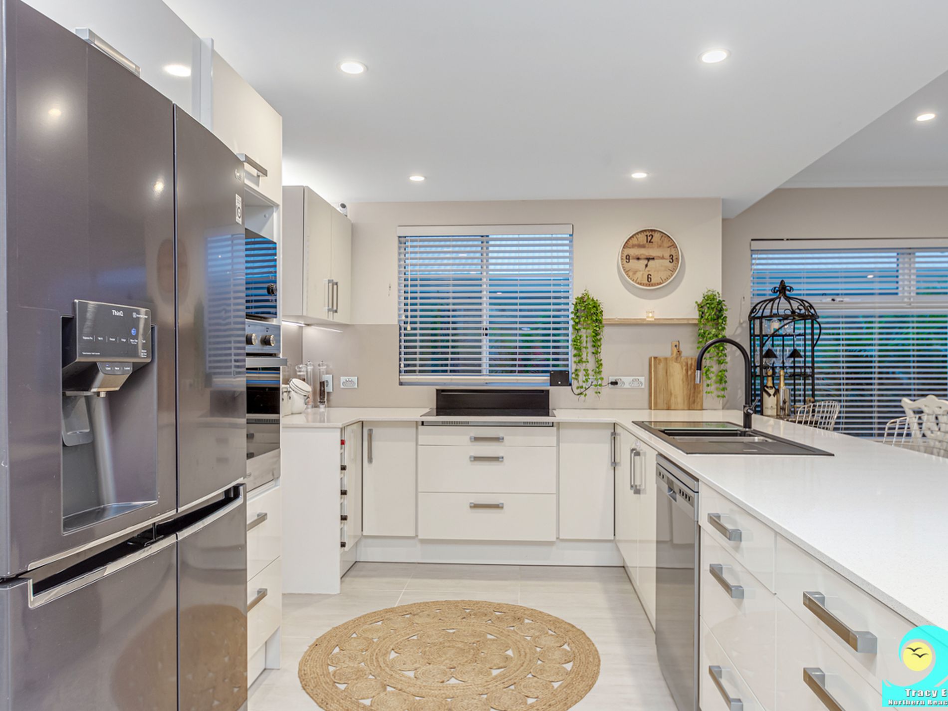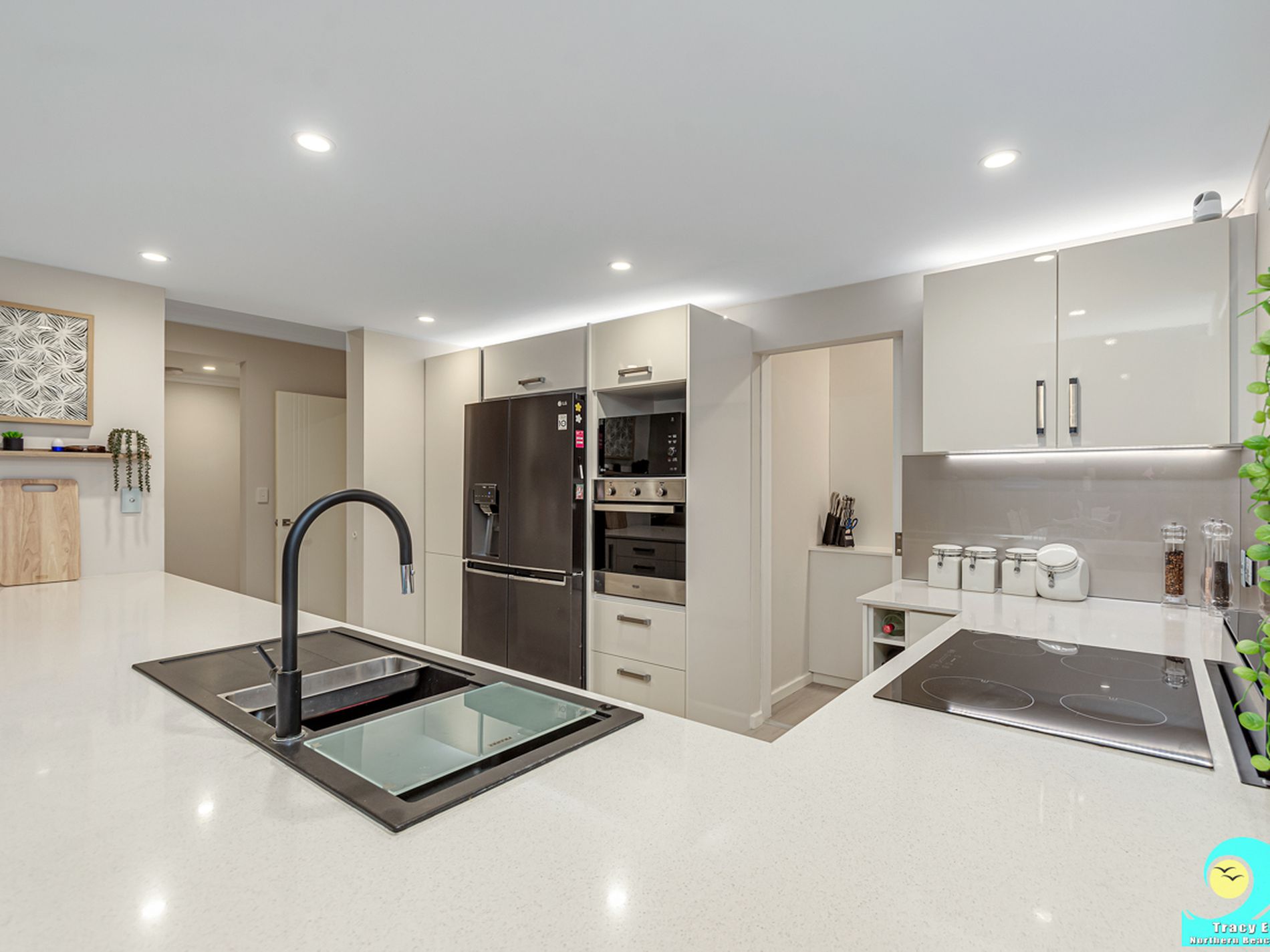 • Stunning kitchen and scullery with stone benchtops, 80cm induction cook-top with down-draft, 60cm wall oven, overhead cupboards, microwave shelf, dishwasher, soft-close to all cupboards and drawers plus double plumbed fridge recess and masses of space for seating at the breakfast bar for fantastic entertaining!