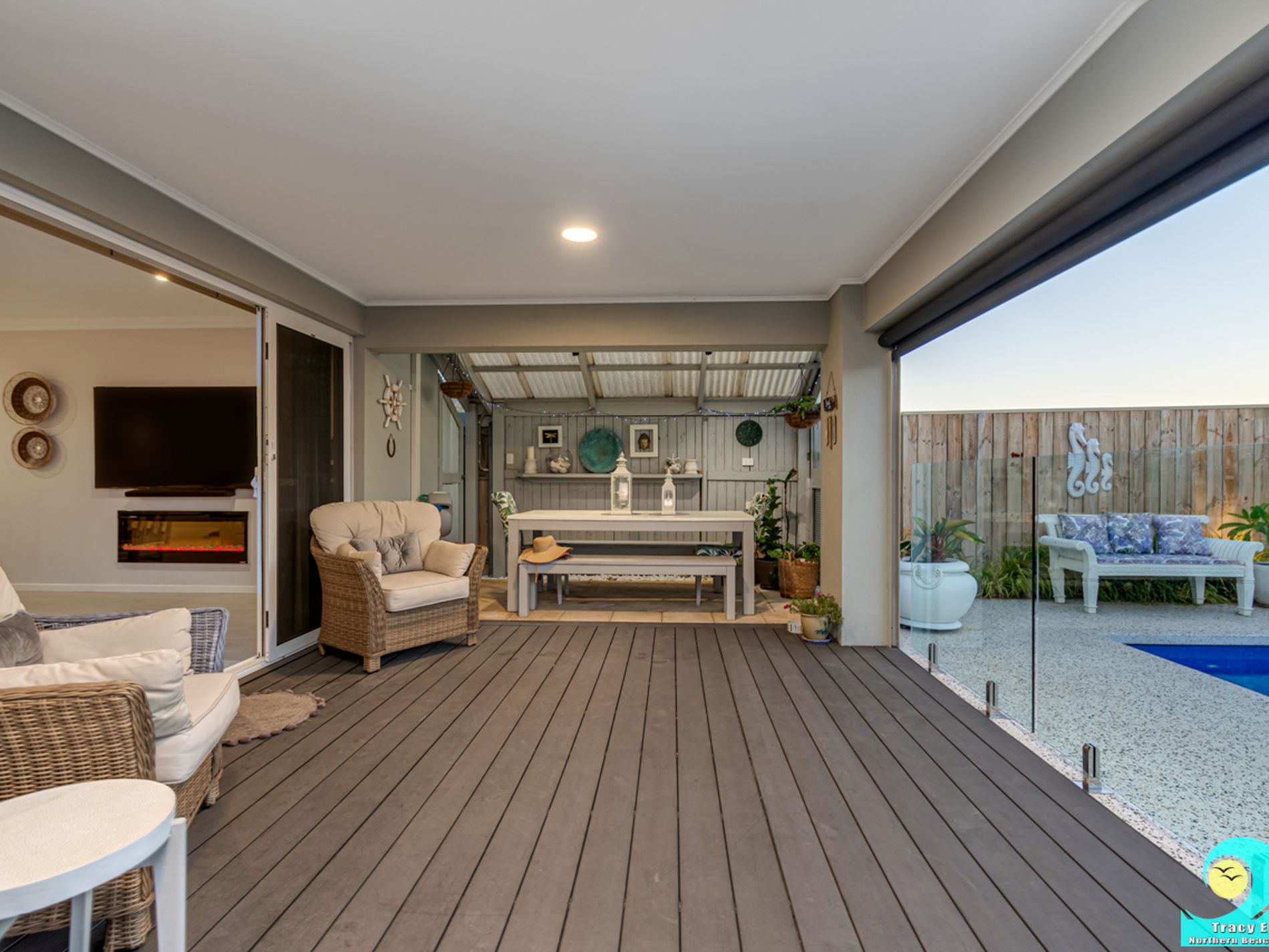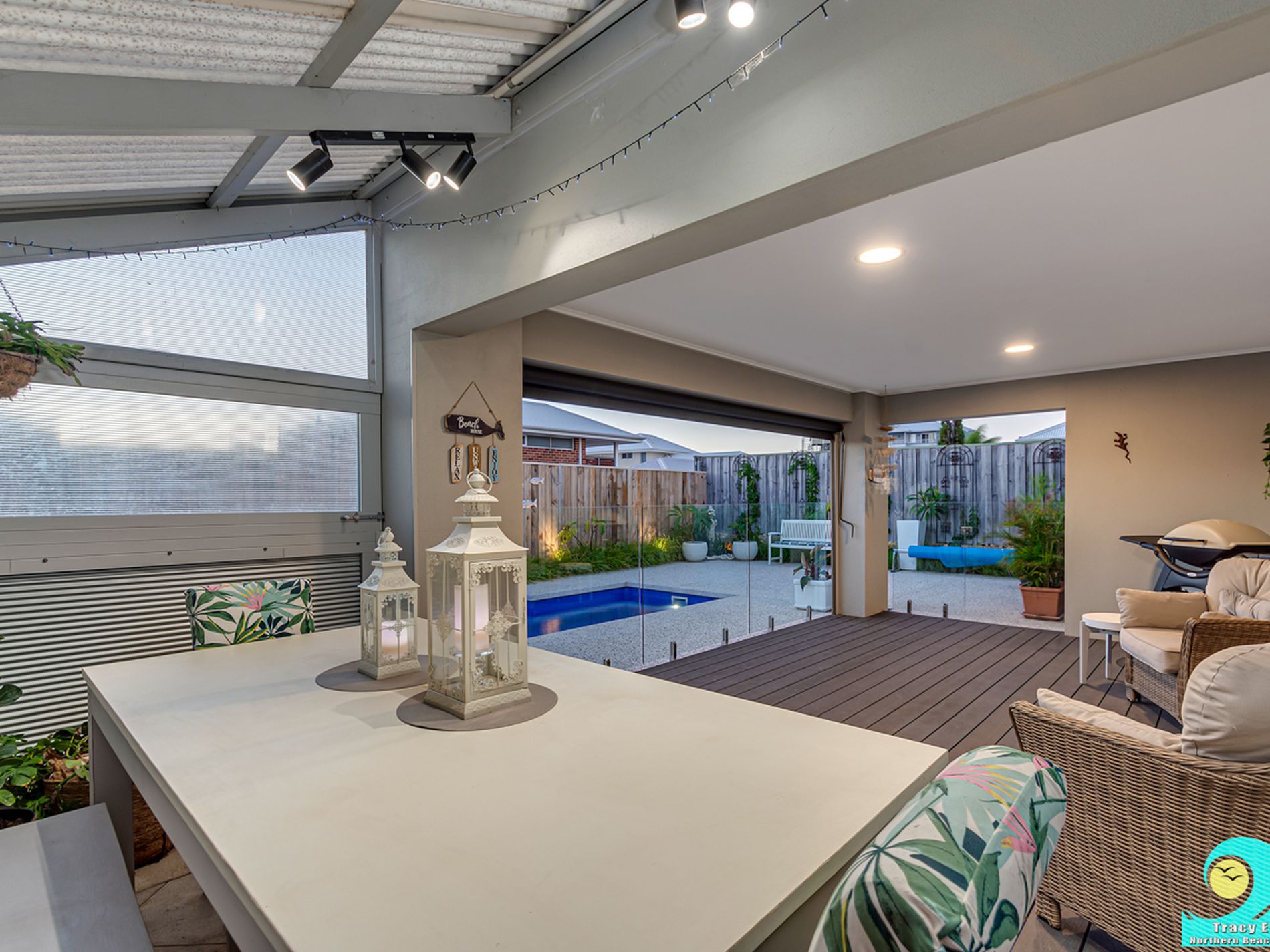 • Substantial open plan dining, living area leading out through big sliders to the huge under roof alfresco and swimming pool all beautifully decked, paved and landscaped with blinds to the alfresco and feature lighting.