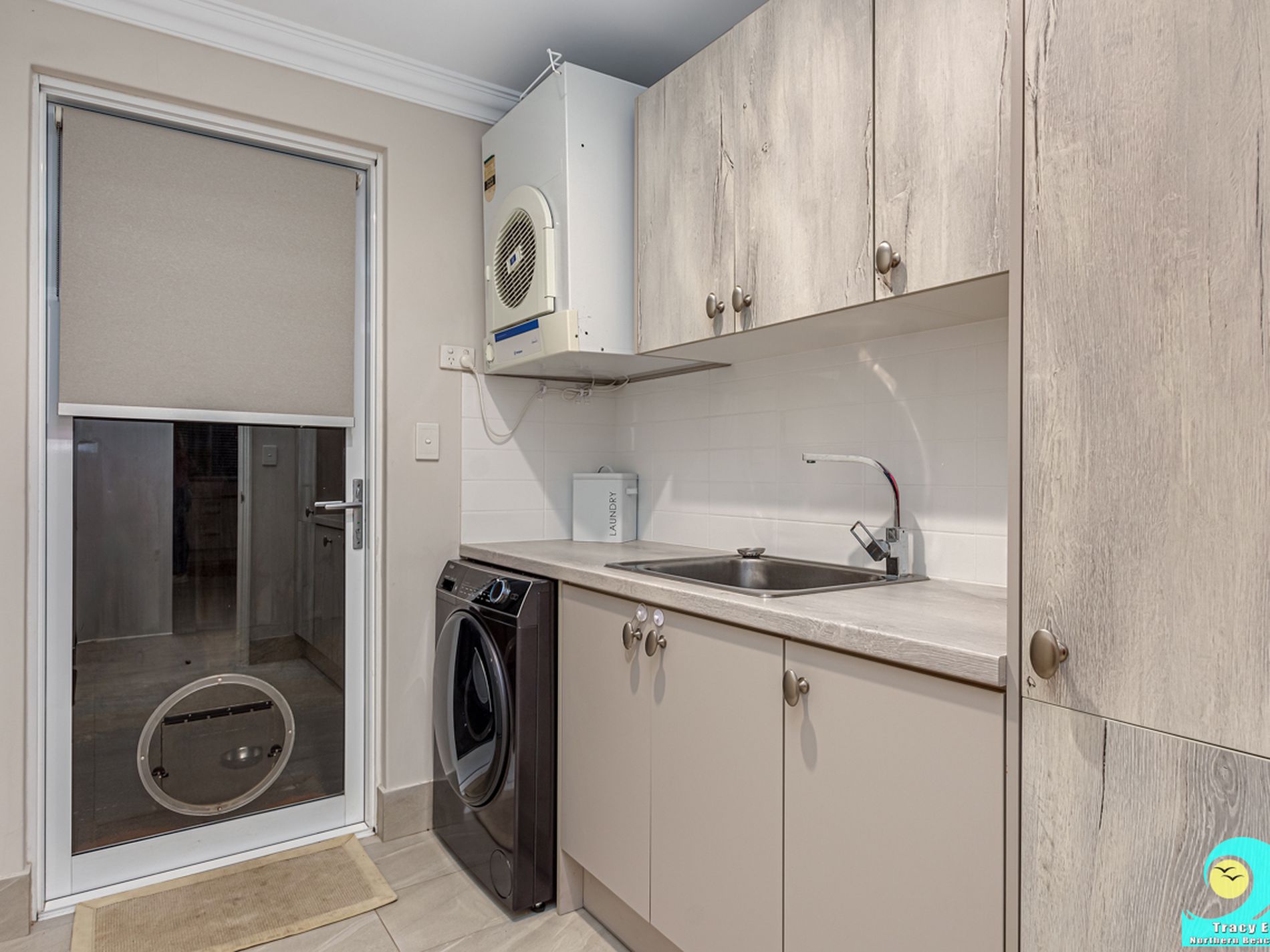 • Laundry with masses storage and like the rest of this well above average home, has a lovely 'Beachy Theme' with drift-wood style bench-top, matching cupboards and security laminate film to entry door from outside.