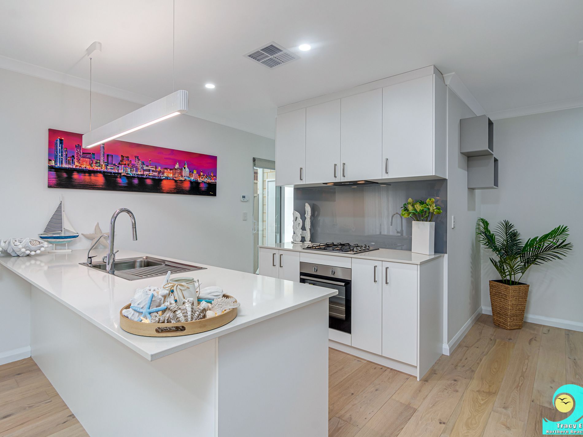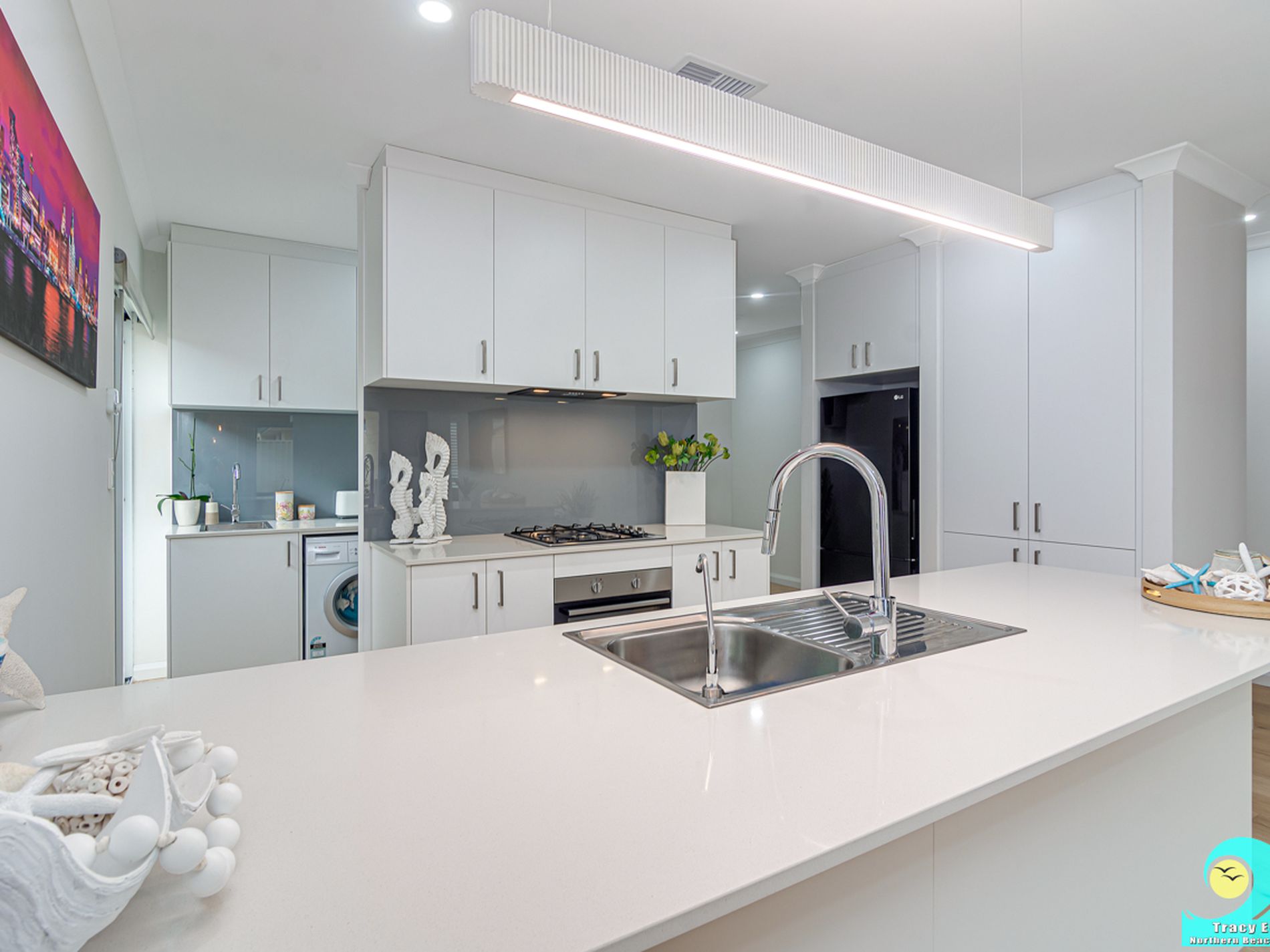 • Kitchen with stone benchtops, loads of storage, overhead cupboards, large pantry, 1000mm fridge space, 60cm gas cooktop, 60cm under-bench oven, integrated rangehood and stylish feature light over the breakfast bar.