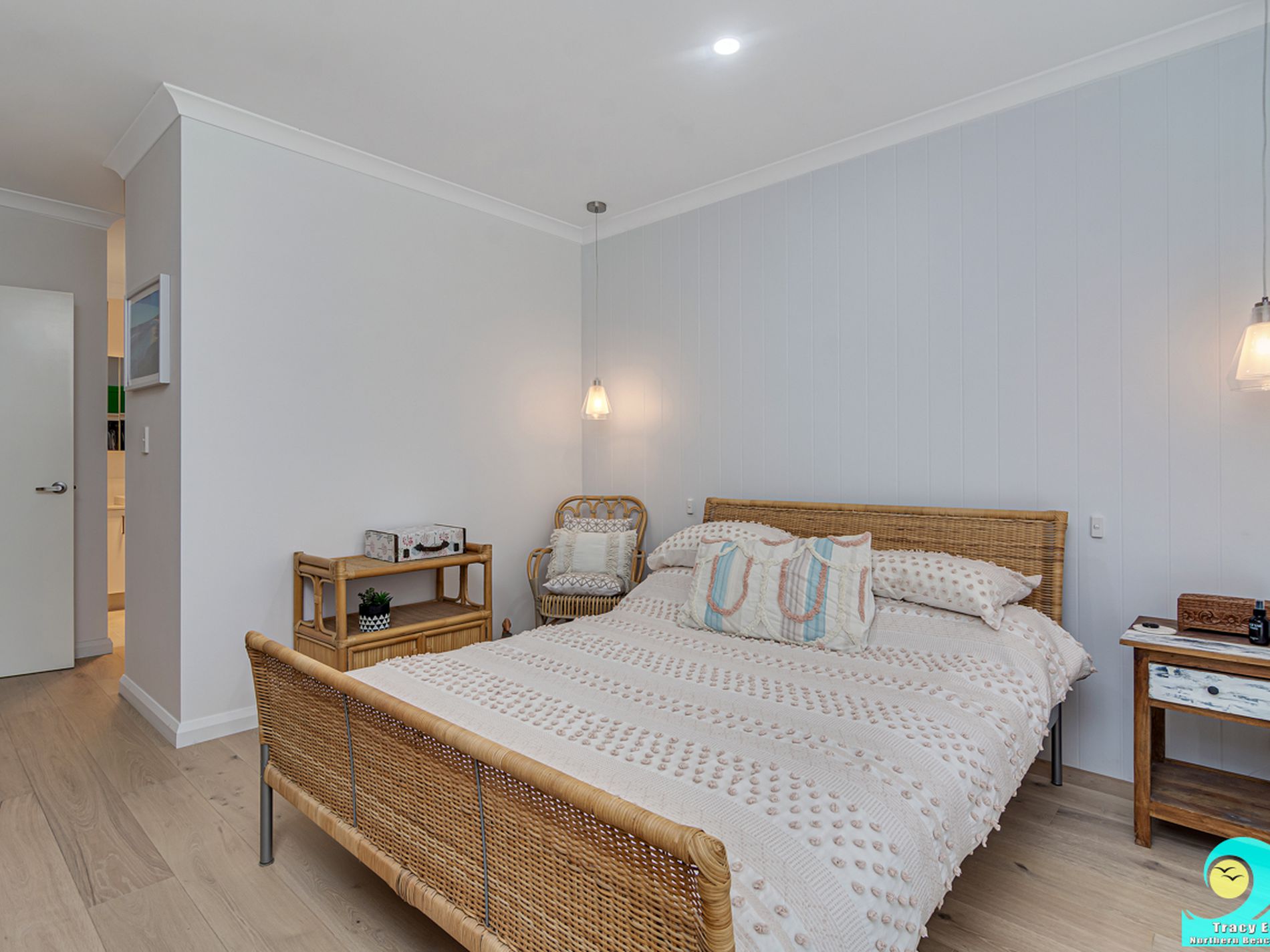 • The primary bedroom is to the rear of the property with a beautiful feature wall behind the bed plus gorgeous hanging side lights, plantation shutters with views to the backyard, super generous walk-in-robe, and ensuite with separate shower (perfect glass) stone top vanity and enclosed WC.
