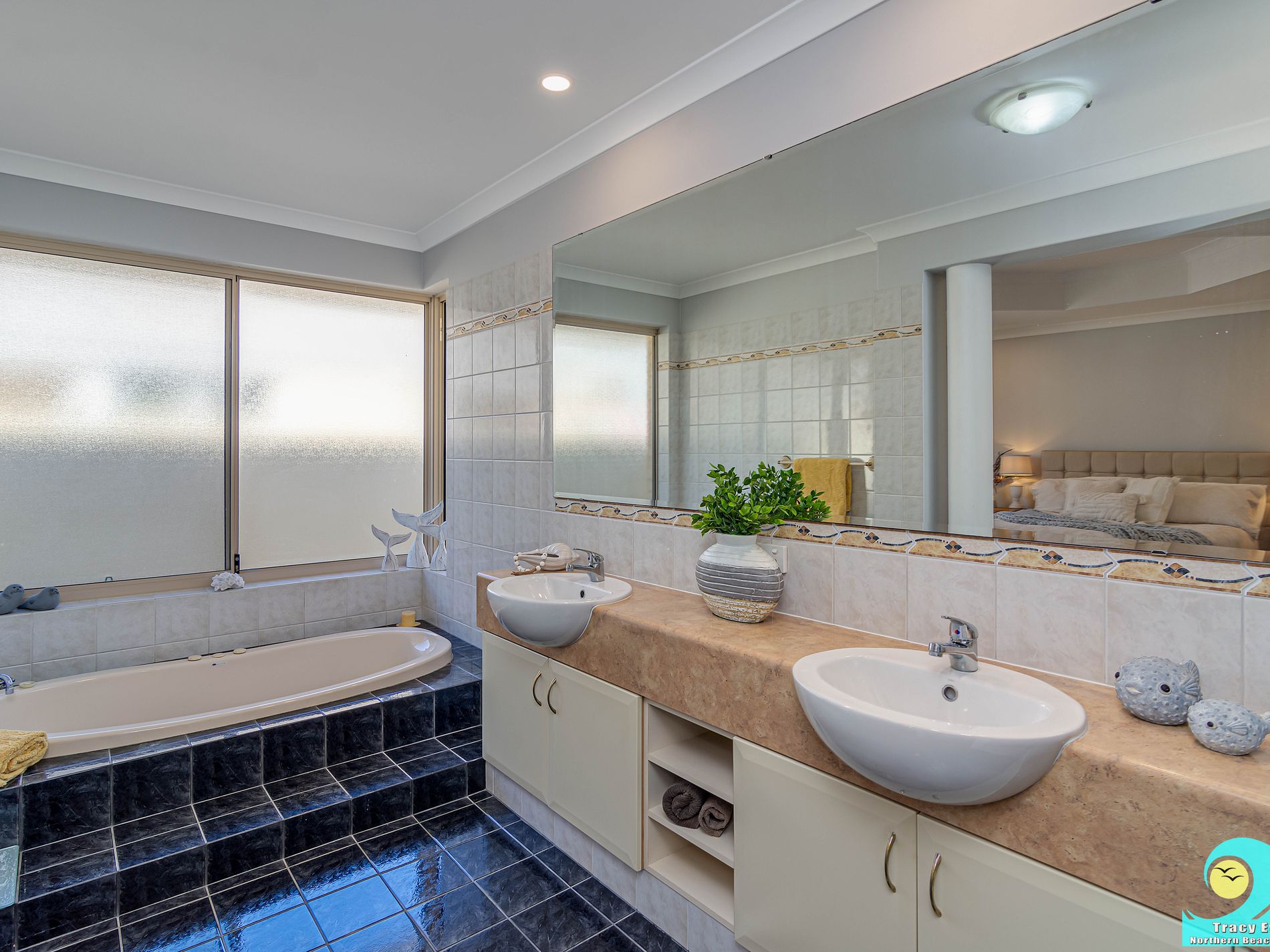 • Master bedroom is set back from the road nicely, located behind the garage for quiet and privacy. This is king-size with stunning high ceiling including recessed octagon feature, a generous walk-in-robe and impressive ensuite with double basins, step-up spa-bath, separate shower and enclosed WC doubling as a powder room with sink and separate entry from the hallway.