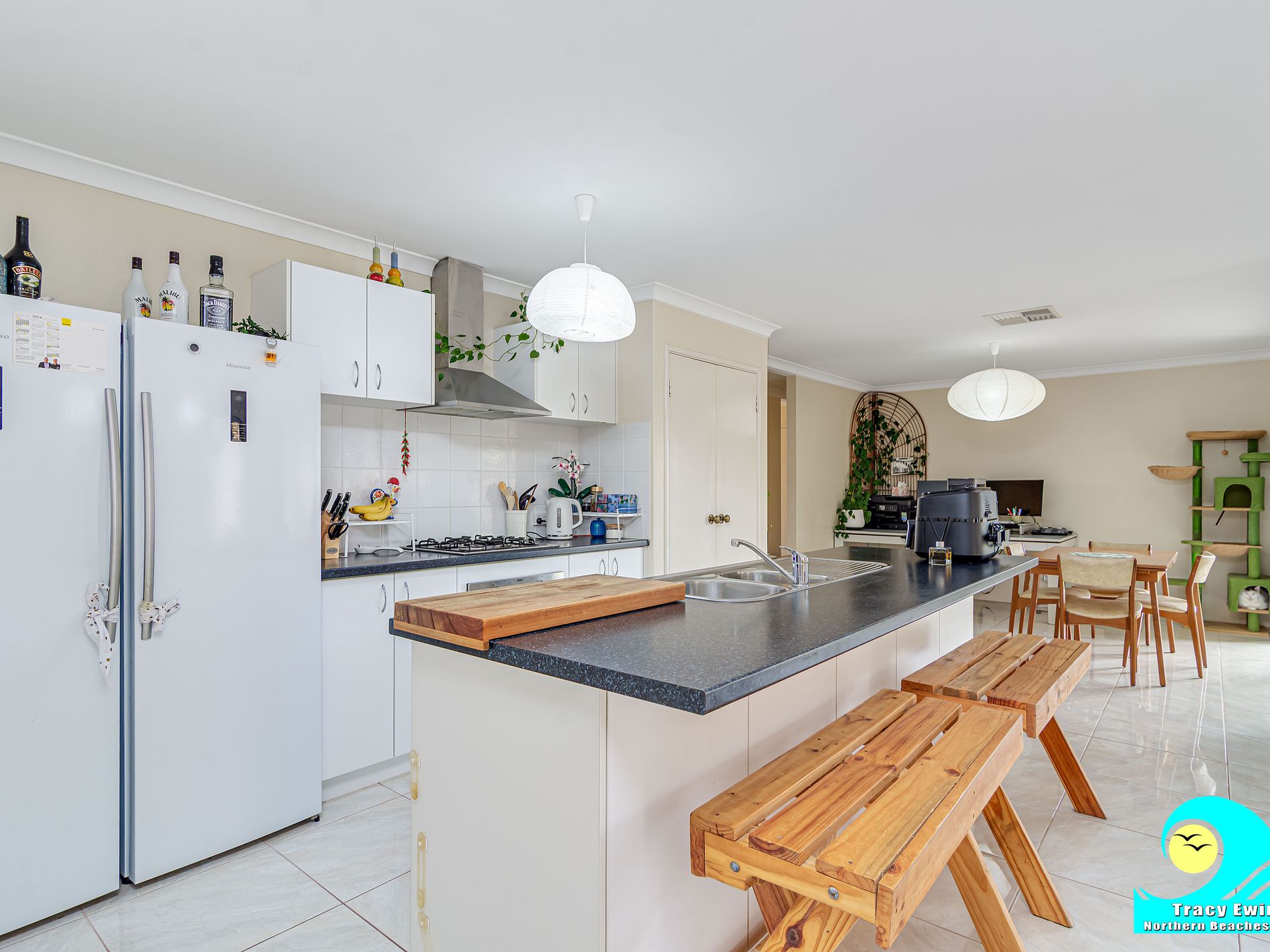 • Kitchen with stainless steel appliances (60cm gas cooktop, 60cm under bench oven, rangehood), breakfast bar, dishwasher recess, double fridge recess and double door pantry, upper cabinets.