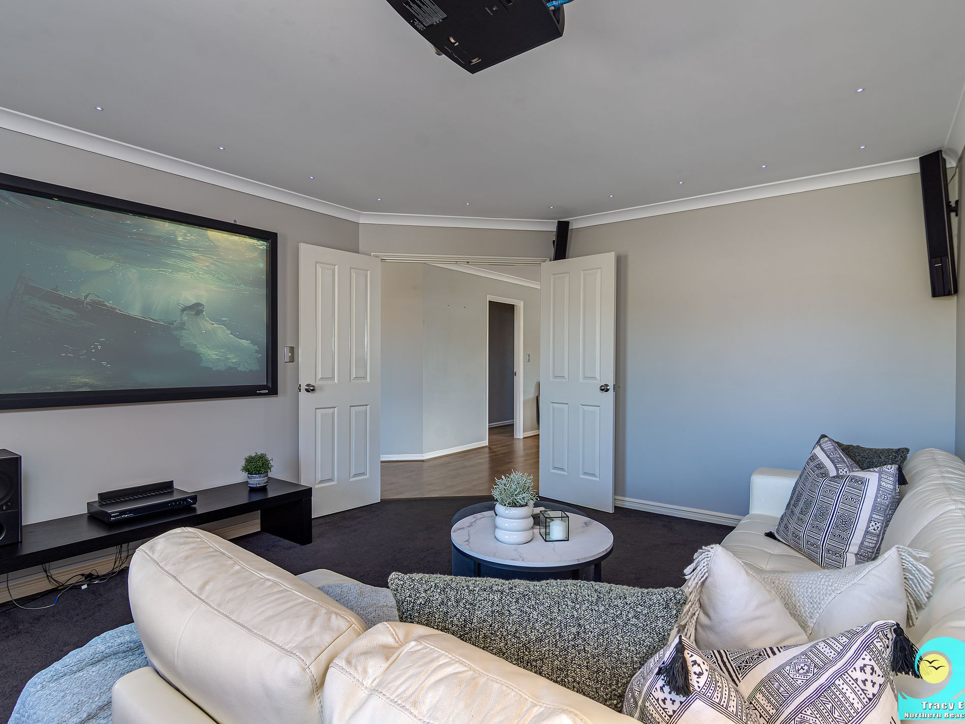 • Next is the very generous dedicated theatre-room enclosed with double doors and including screen and projector.
