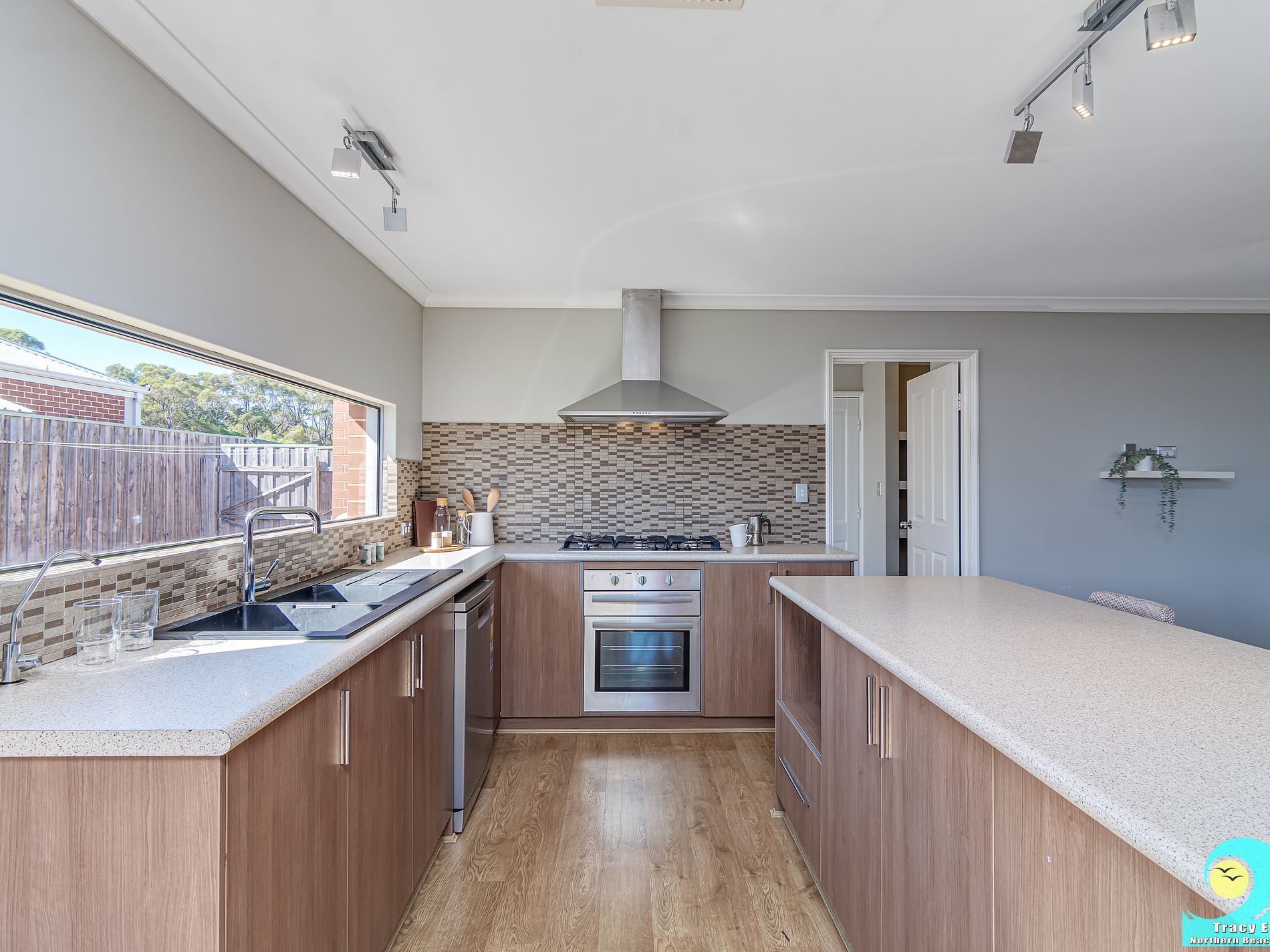 • Kitchen with loads of bench-space, island with breakfast bar, window at bench level gives amazing light, appliances include dishwasher, 90cm gas cook-top and rangehood with 60cm under-bench oven and plenty of space for your double fridge. Plus, butlers-pantry / linen press in the adjacent laundry.
