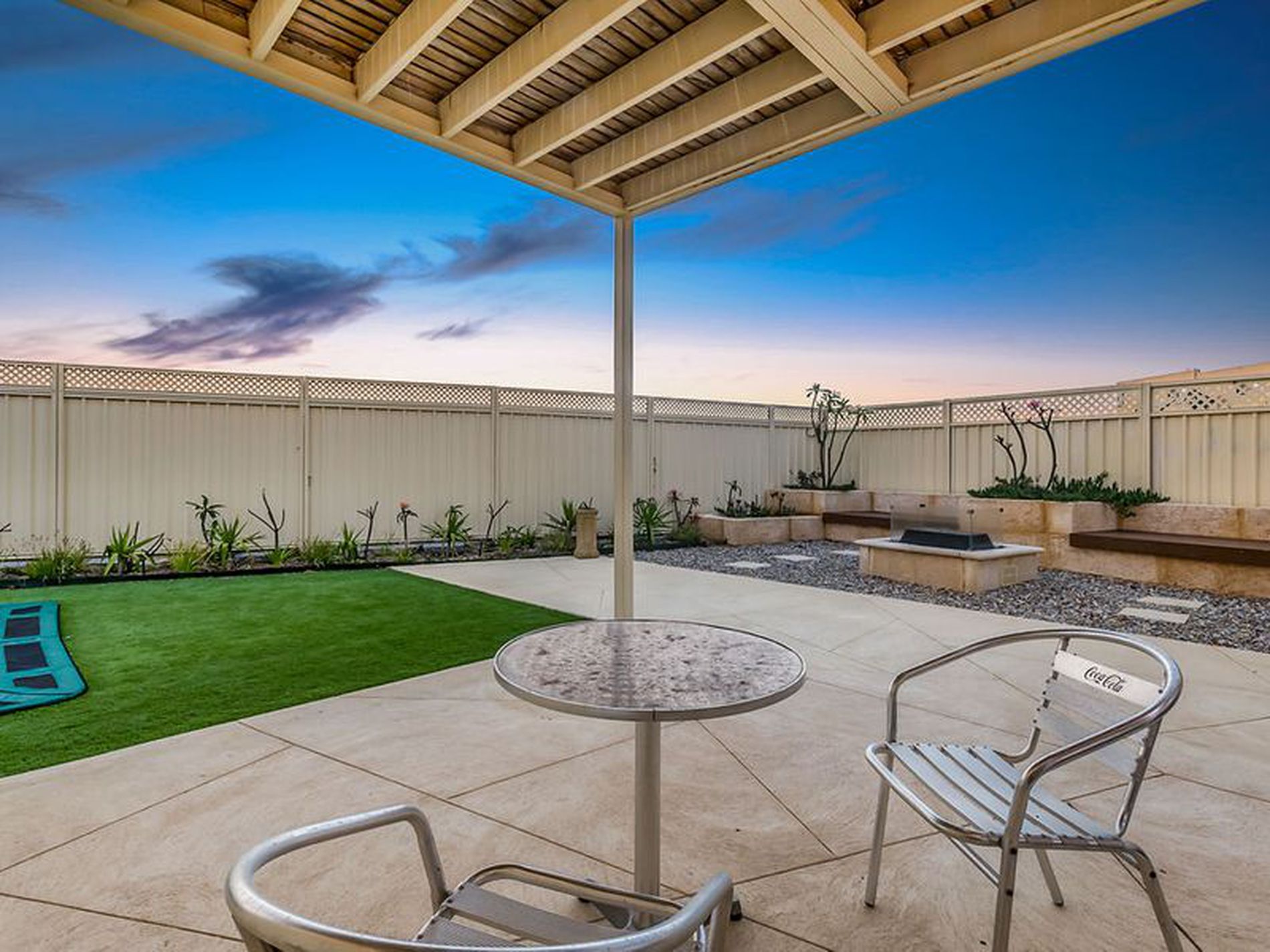 - Gas fire-pit with glass surround and buit-in-seating.