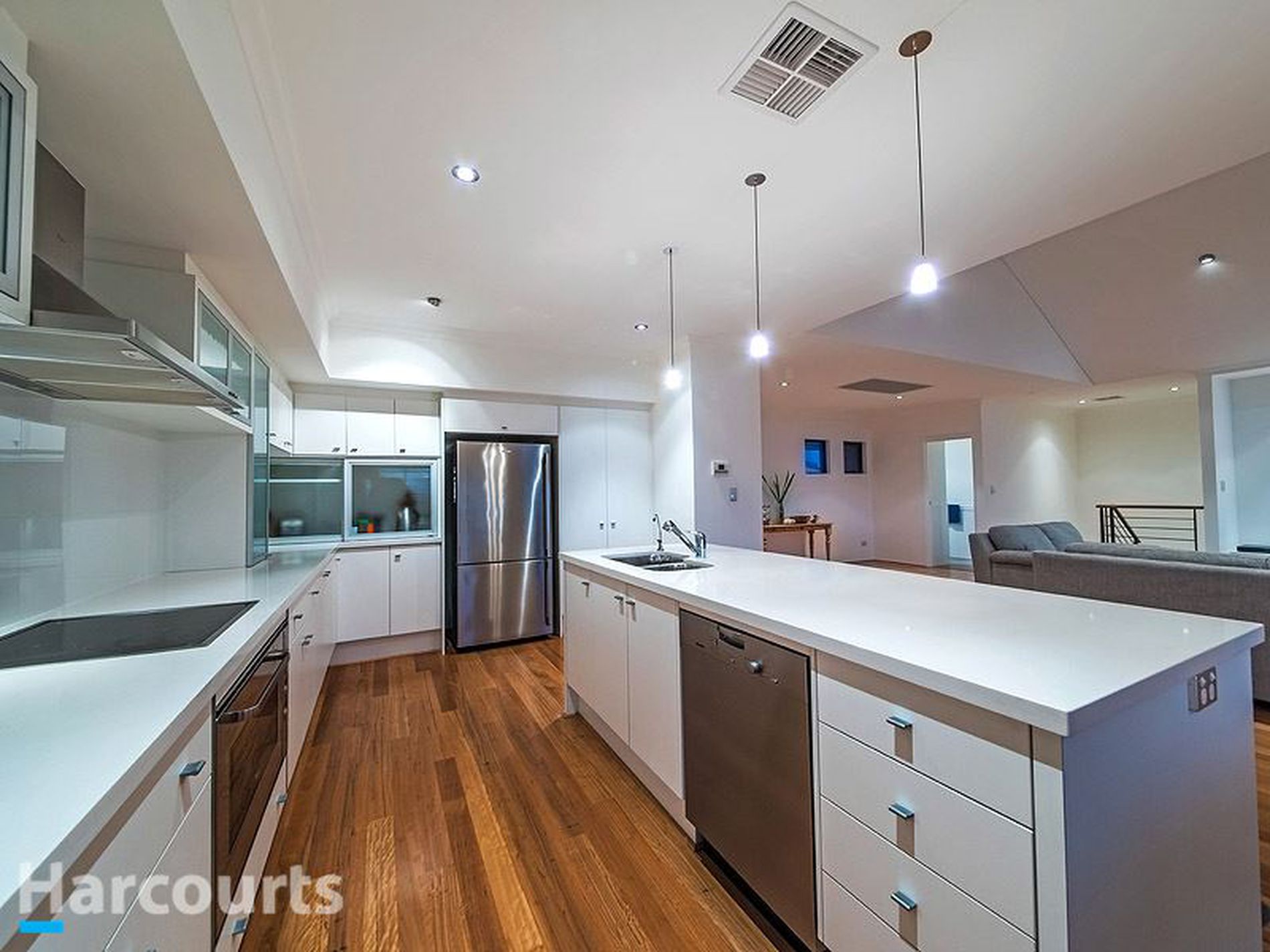 *Kitchen with center Island/breakfast bar and masses of bench space (all stone), appliance and over-head cupboards, large fridge recess, dishwasher, 60cm Induction cook-top, 90cm under-bench oven and soft-close to all cabinetry.