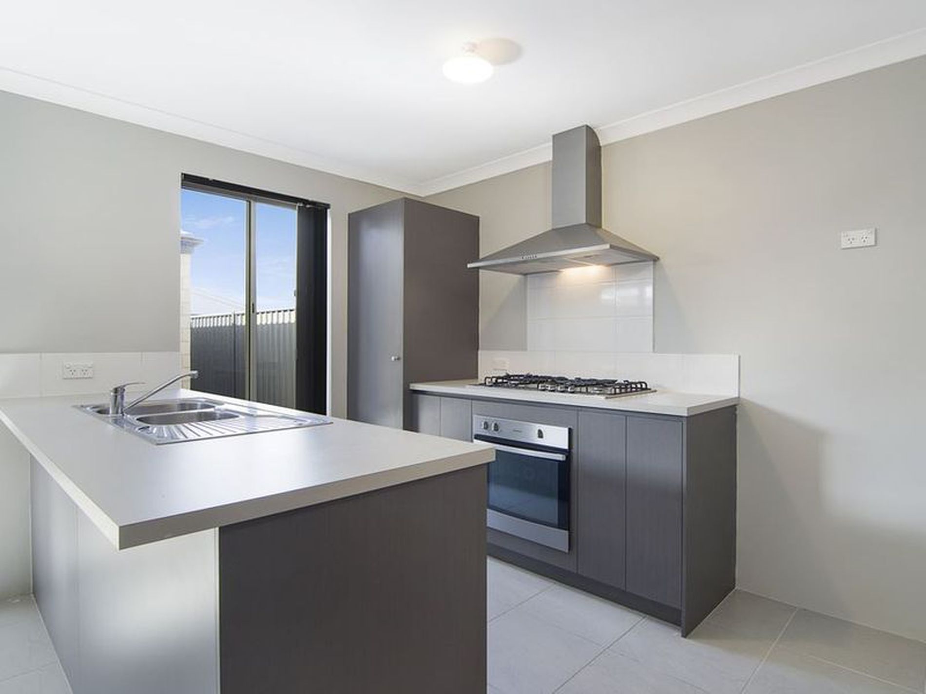 *Kitchen with laminate bench-top, 60cm gas cook-top and range-hood and 60cm under-bench oven.