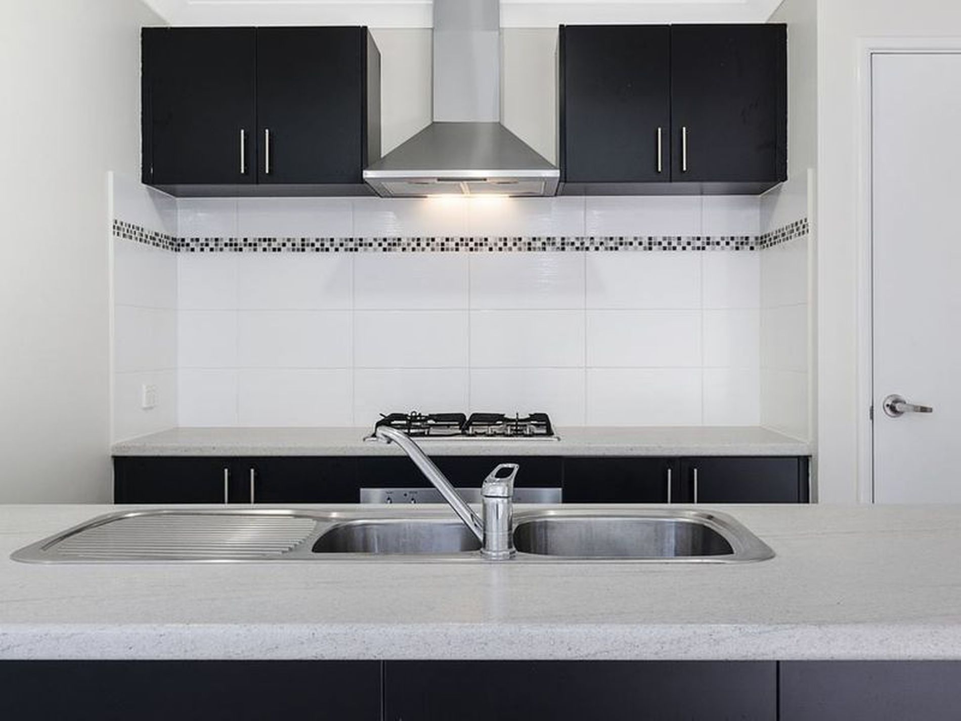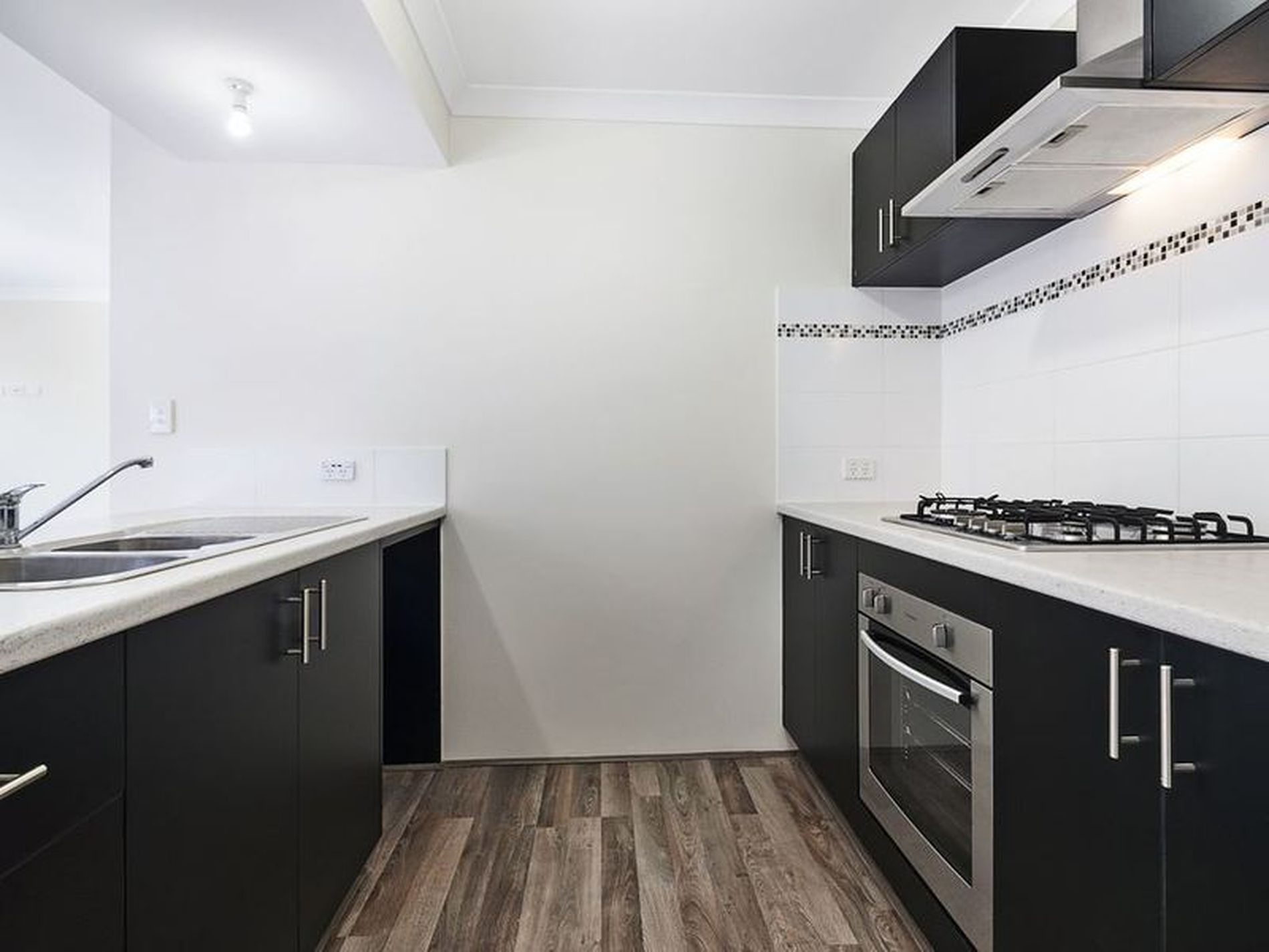 -Kitchen with laminate tops, water to fridge recess, 90cm gas cook-top and range-hood, 60cm under-bench oven, double sink, dishwasher recess, single pantry and overhead cupboards.