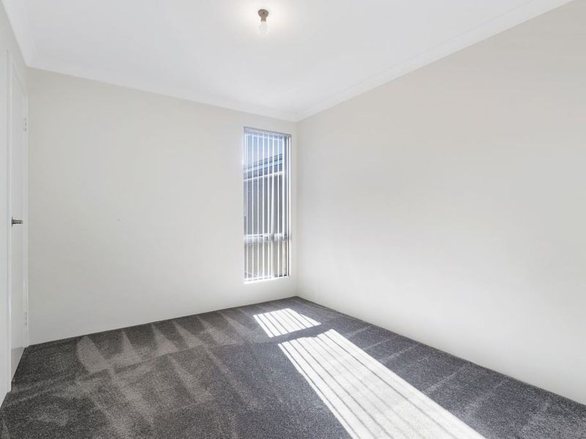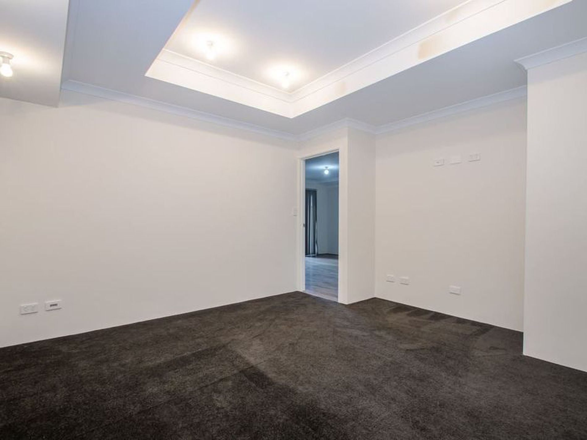 -Media room with single door, feature raised ceiling and wall recessed with TV and power points ready for a wall mounted TV.