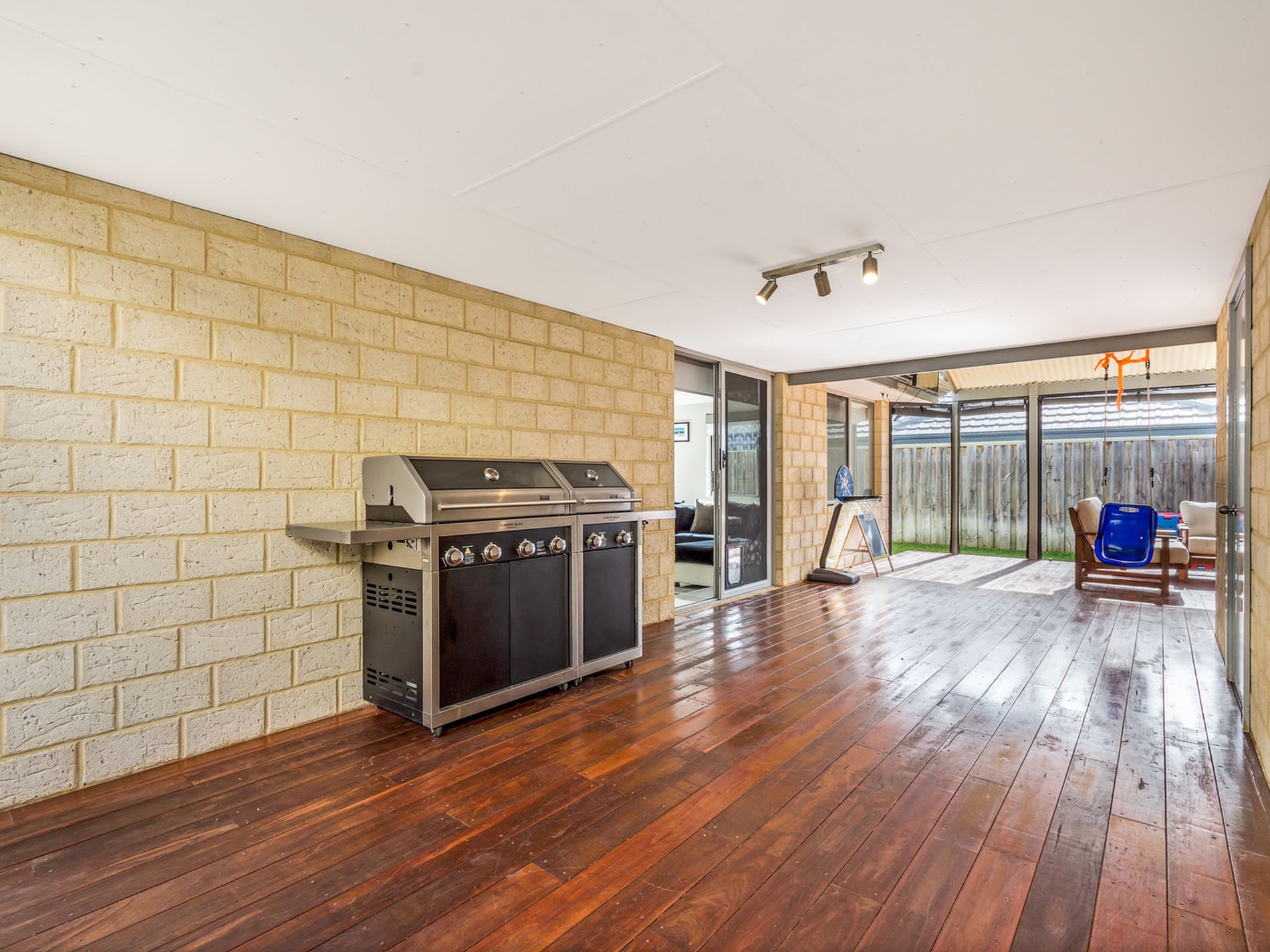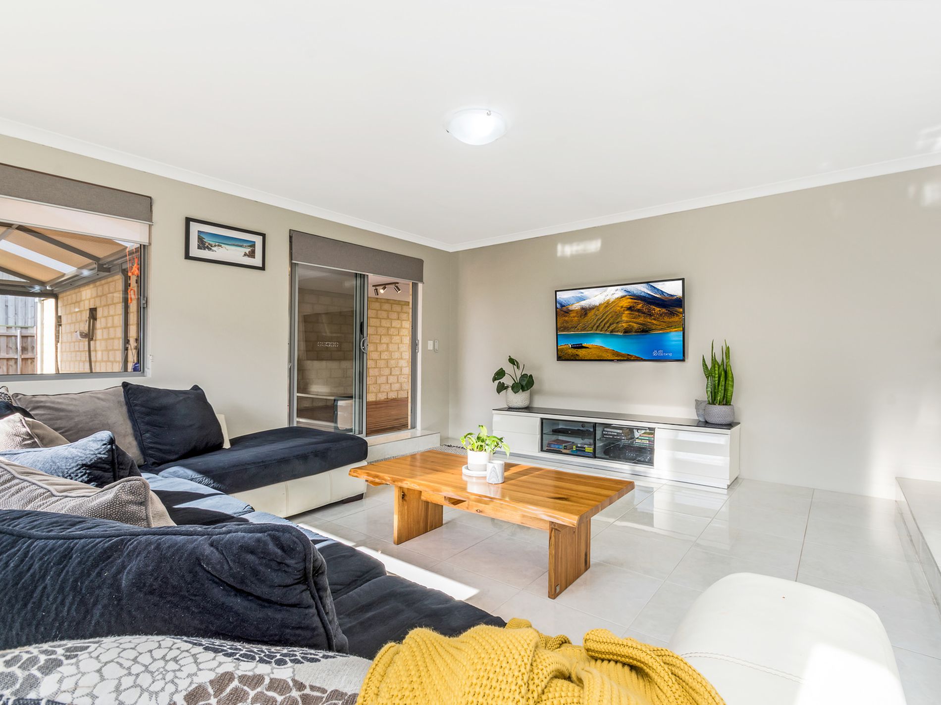 * Light and bright large open plan kitchen, dining and step-down living area with wood-burner and split system AC and leading out to a large (Shire Approved) patio with lighting, TV point, built in Pizza Oven plus all weather-blinds so this area can be used year round!!