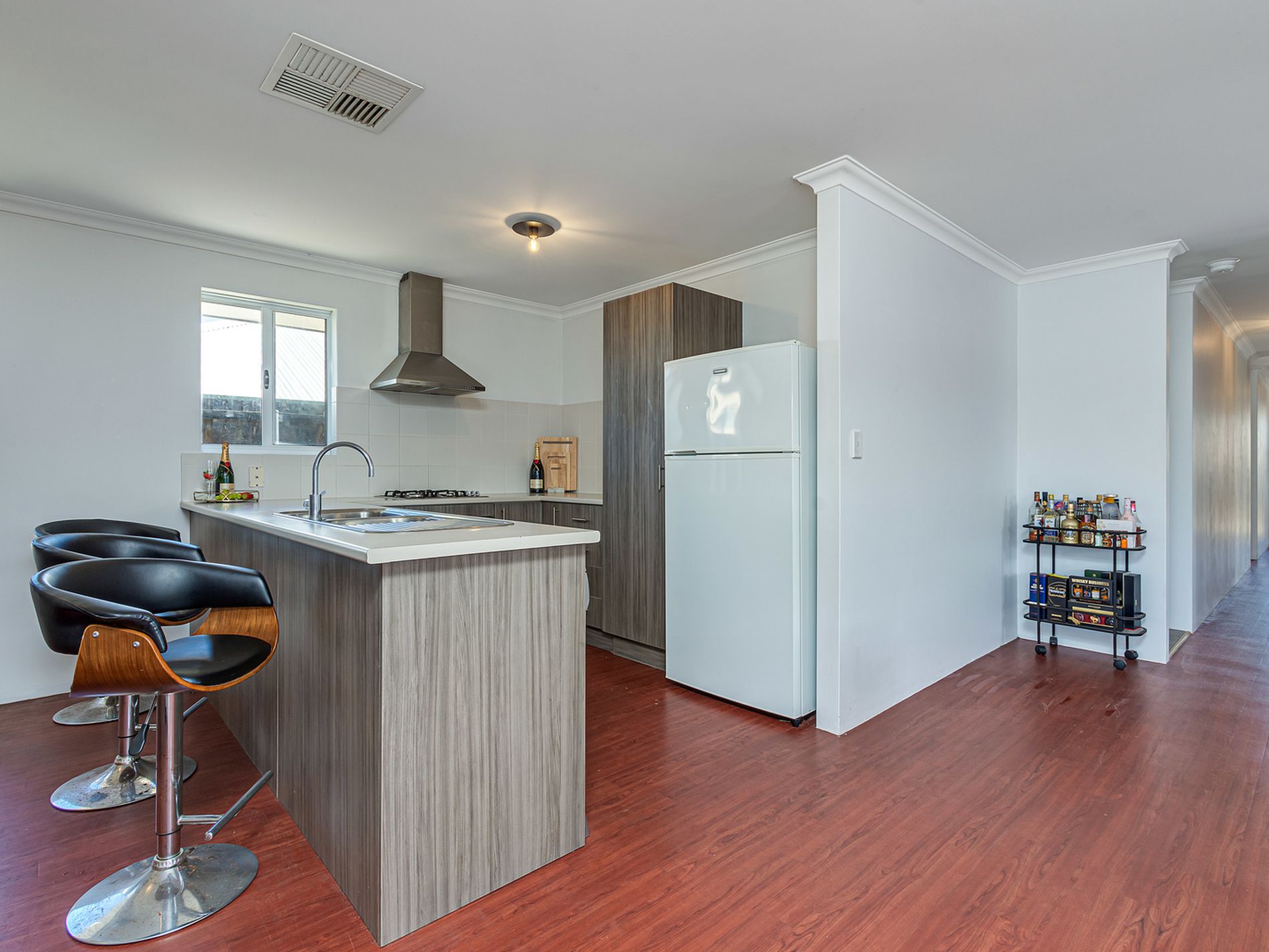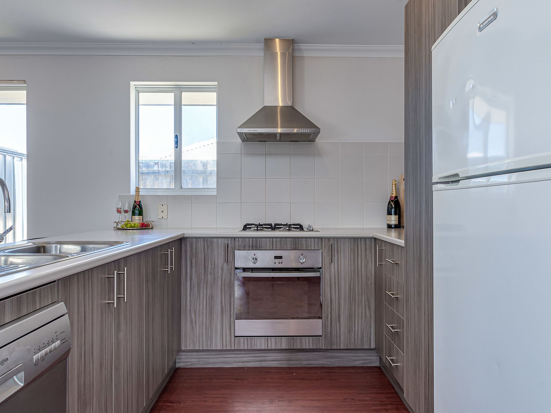 * Kitchen is light and bright with nazzy cabinetry, plenty of bench and cupboard space, laminate tops, 60cm appliances and dishwasher.