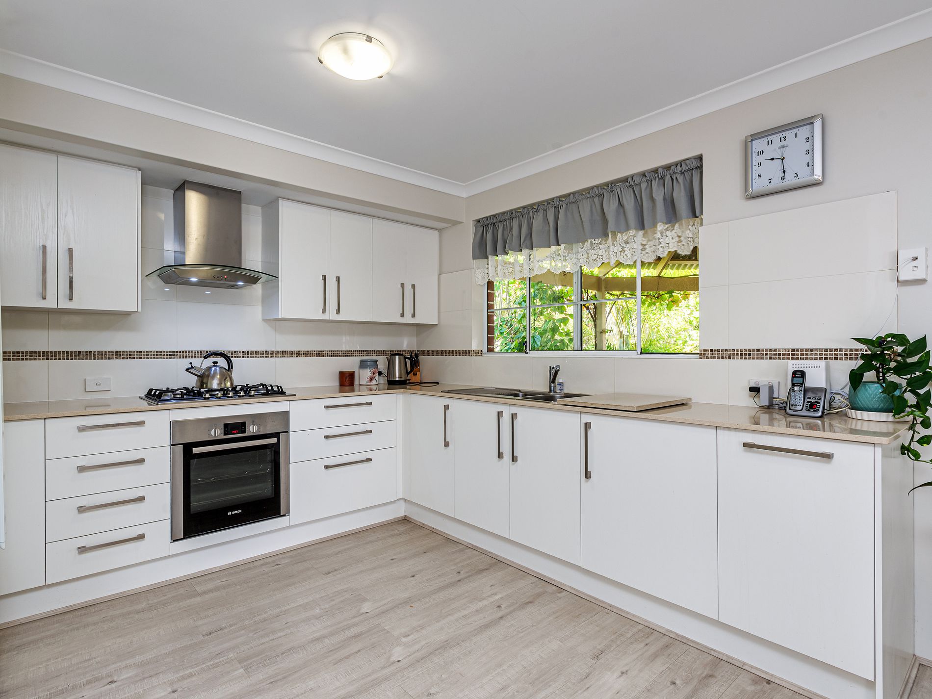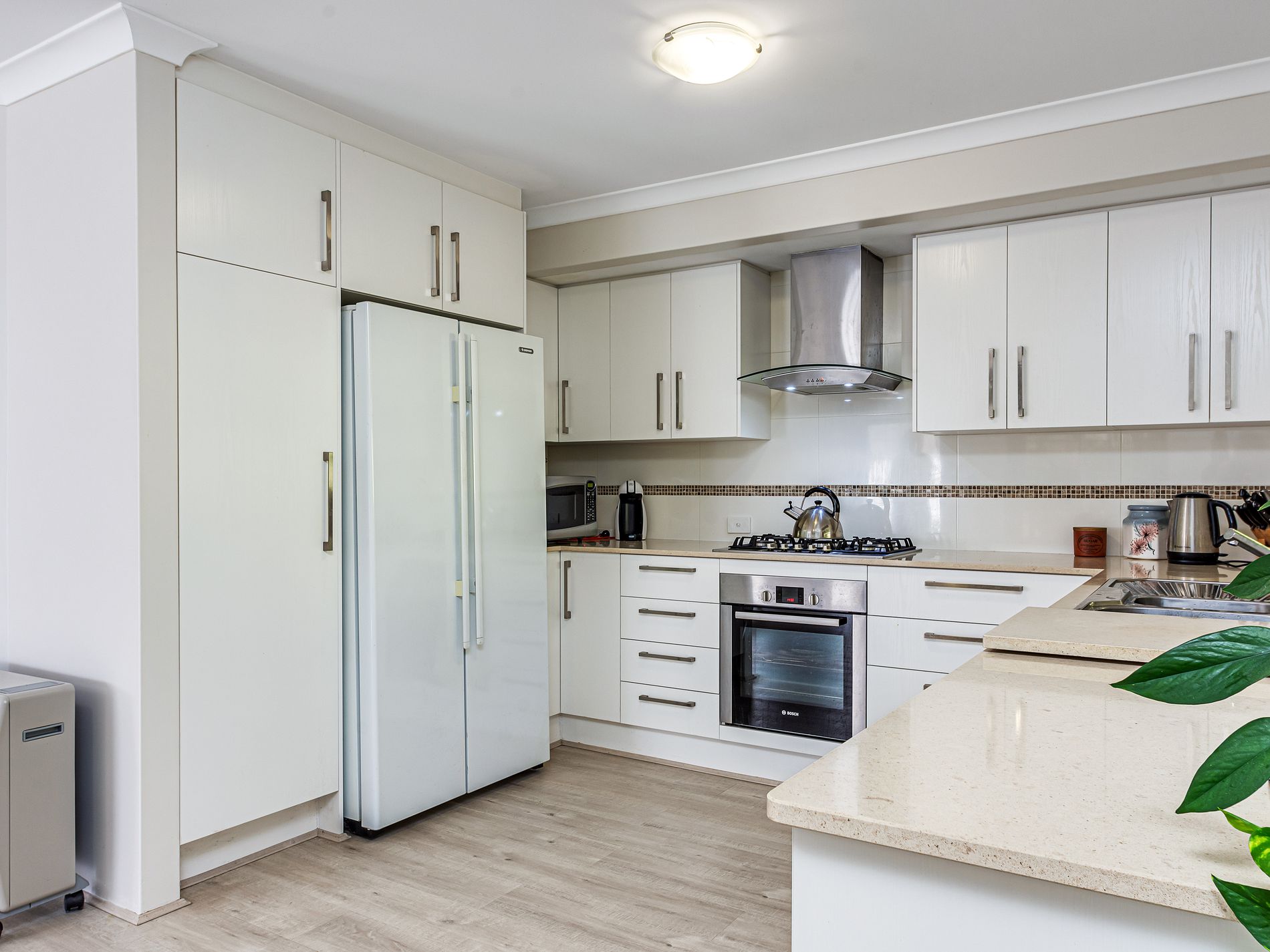 • Kitchen with bulkhead, stone bench-tops, loads of over-head cupboards, 90cm gas cook-top and rangehood, 60cm electric under-bench oven and double fridge recess.