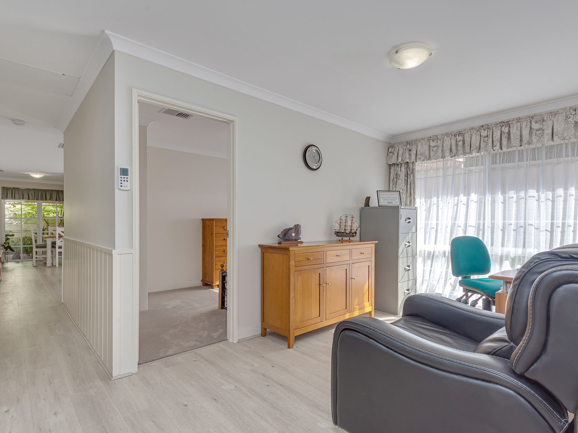 Beautifully renovated and presented throughout, with gorgeous white timber wall panelling and new beachy whitewash wood-look flooring, this 2002 built 4 bedroom, 2 bathroom home with 2 living areas plus study and a large secure parking area for your boat and caravan is the perfect downsizer for retirees who want to lock and leave and travel or even for a young family.