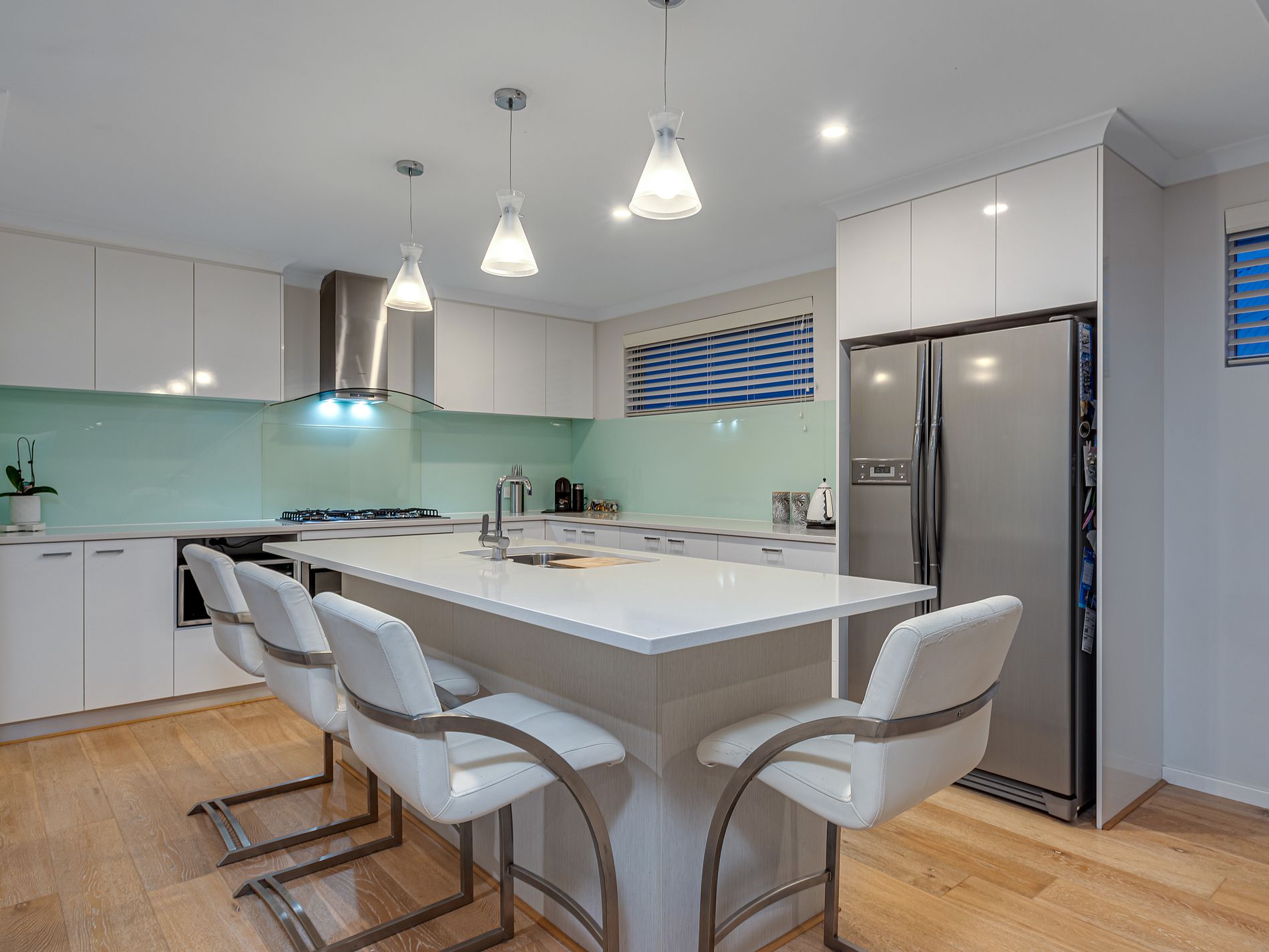 • Kitchen is beautifully appointed with stone bench-tops, overhead cupboards, walk-in-pantry, Island/breakfast bar, plenty of workspace, 90cm gas cook-top, 90cm under-bench oven, 90cm stylish rangehood, dishwasher and space for your double fridge.