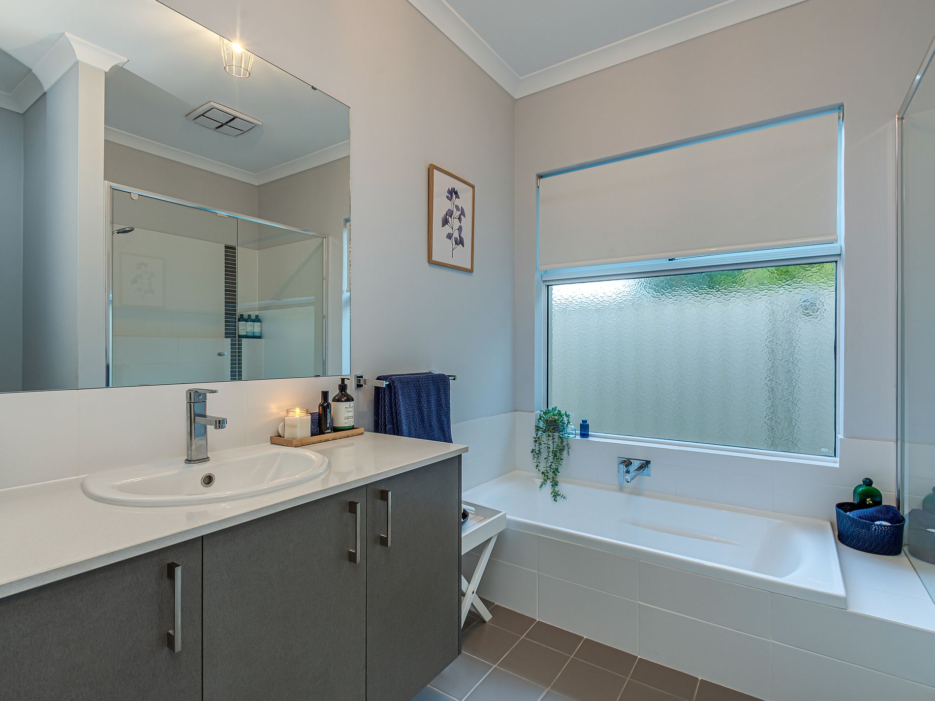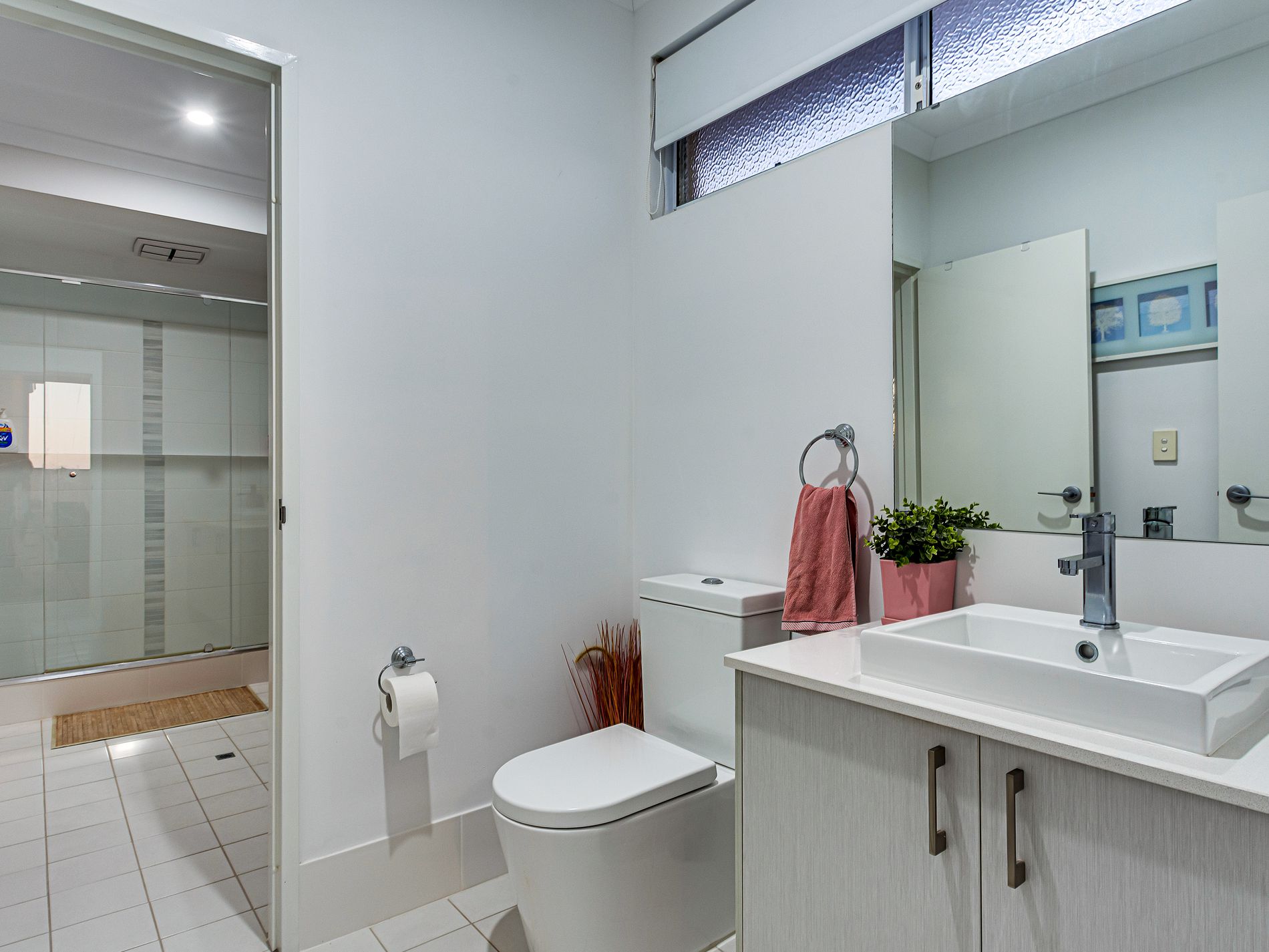 • Laundry with stone benchtop, overhead cupboards and triple linen