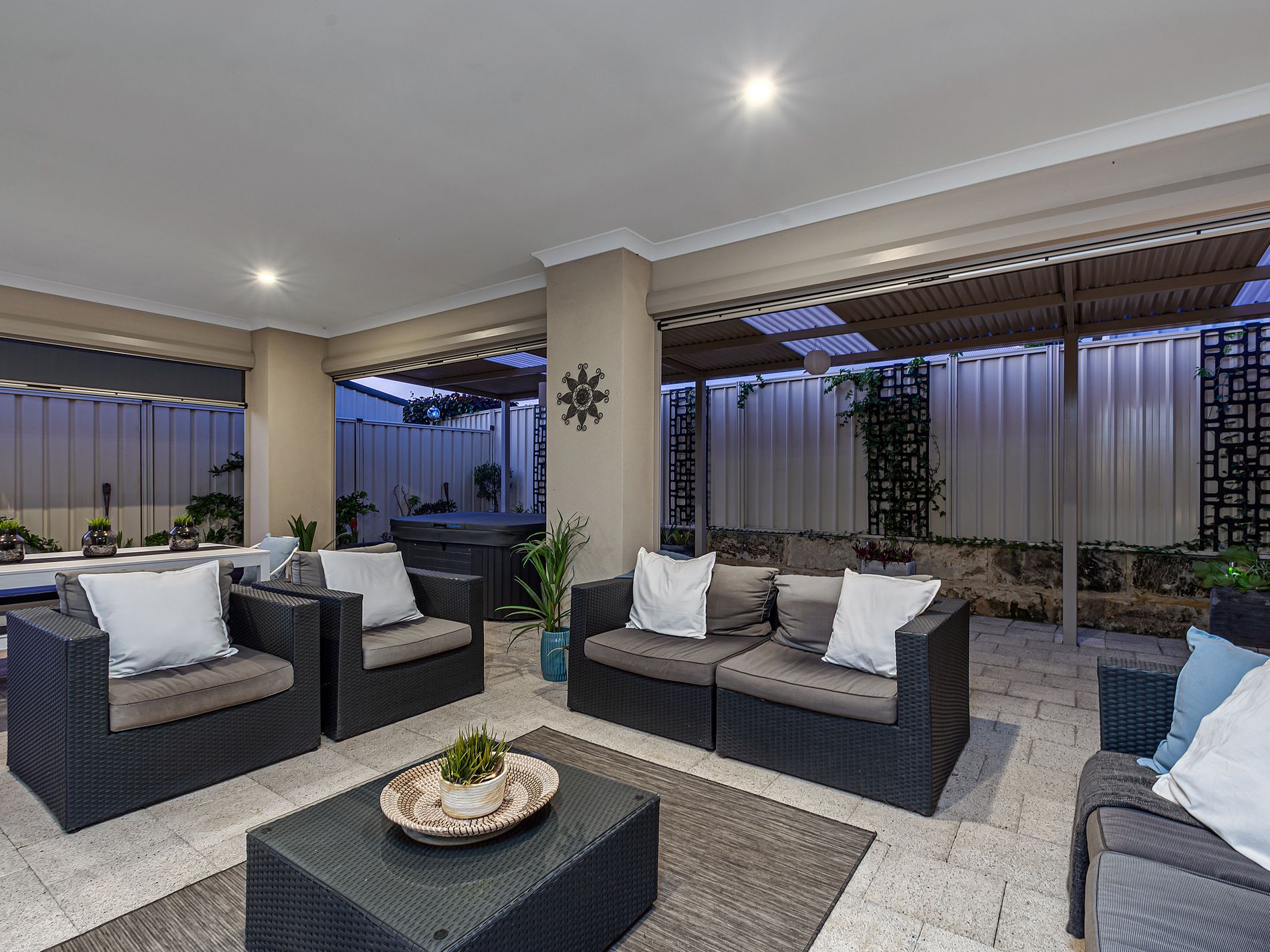 • Open-plan kitchen, dining, living leading out to extensive under-roof outdoor entertainment area with additional patio, weather-blinds and attractive easy- care gardens with plenty or space for a future lap-pool on the Northern side to enjoy the sun should it be on the wish list!