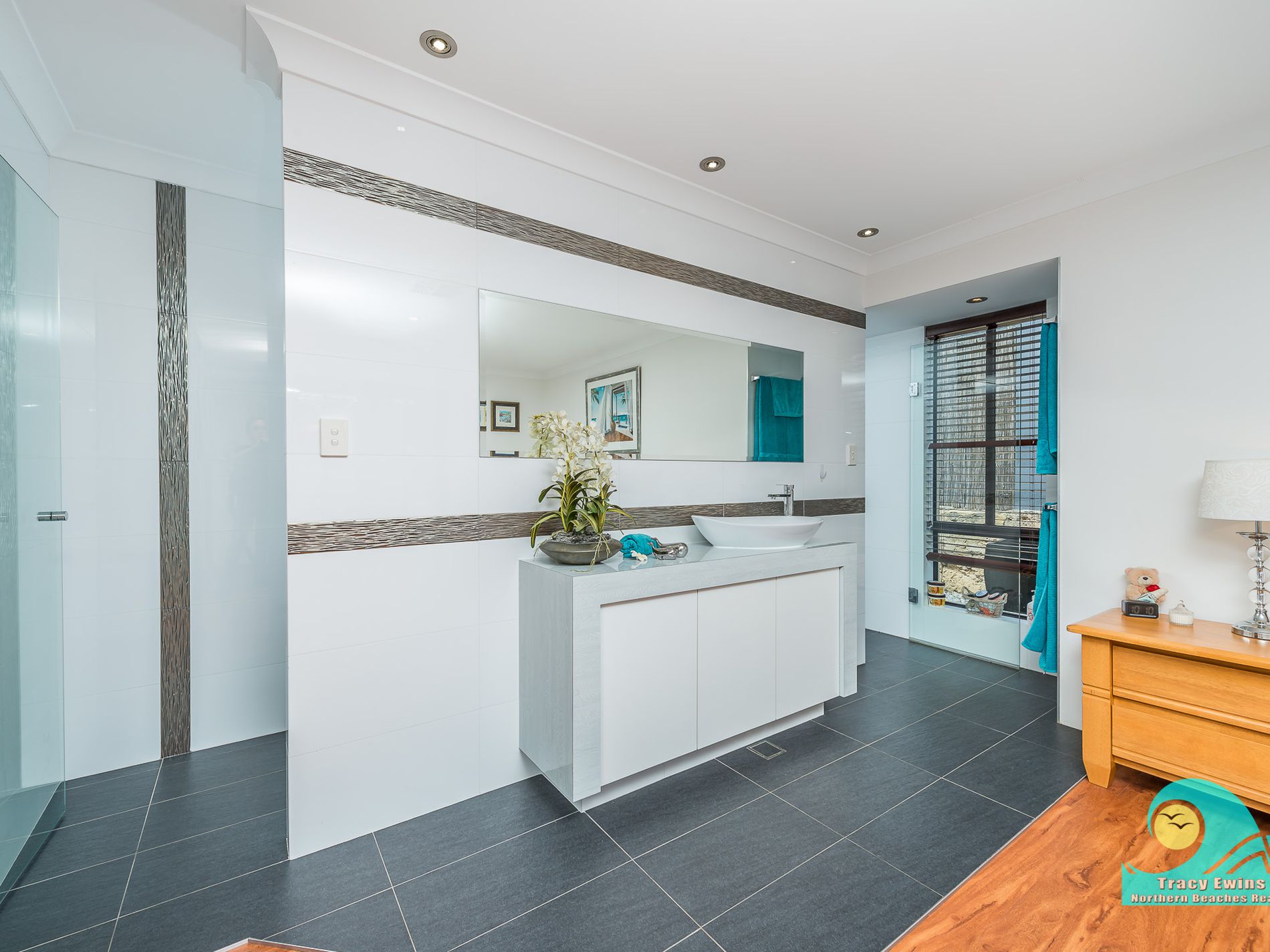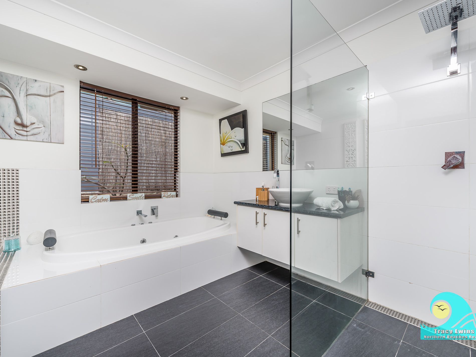 • Main bathroom is stunning with hob-less shower, feature spa bath and stylish vanity.