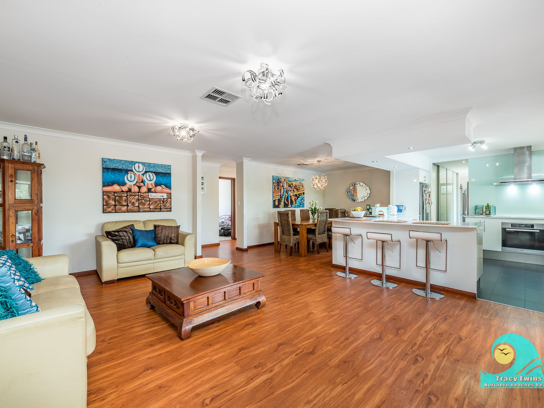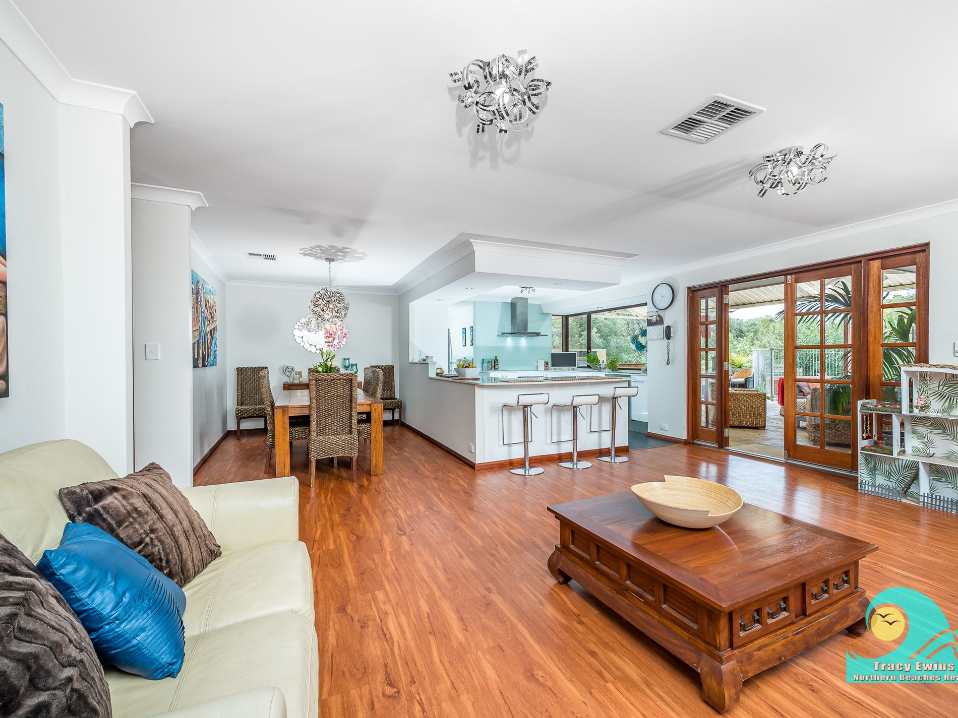 • Super-sized main living and dining area leads out through gorgeous timber French doors to the alfresco, BBQ area, bar and pool!