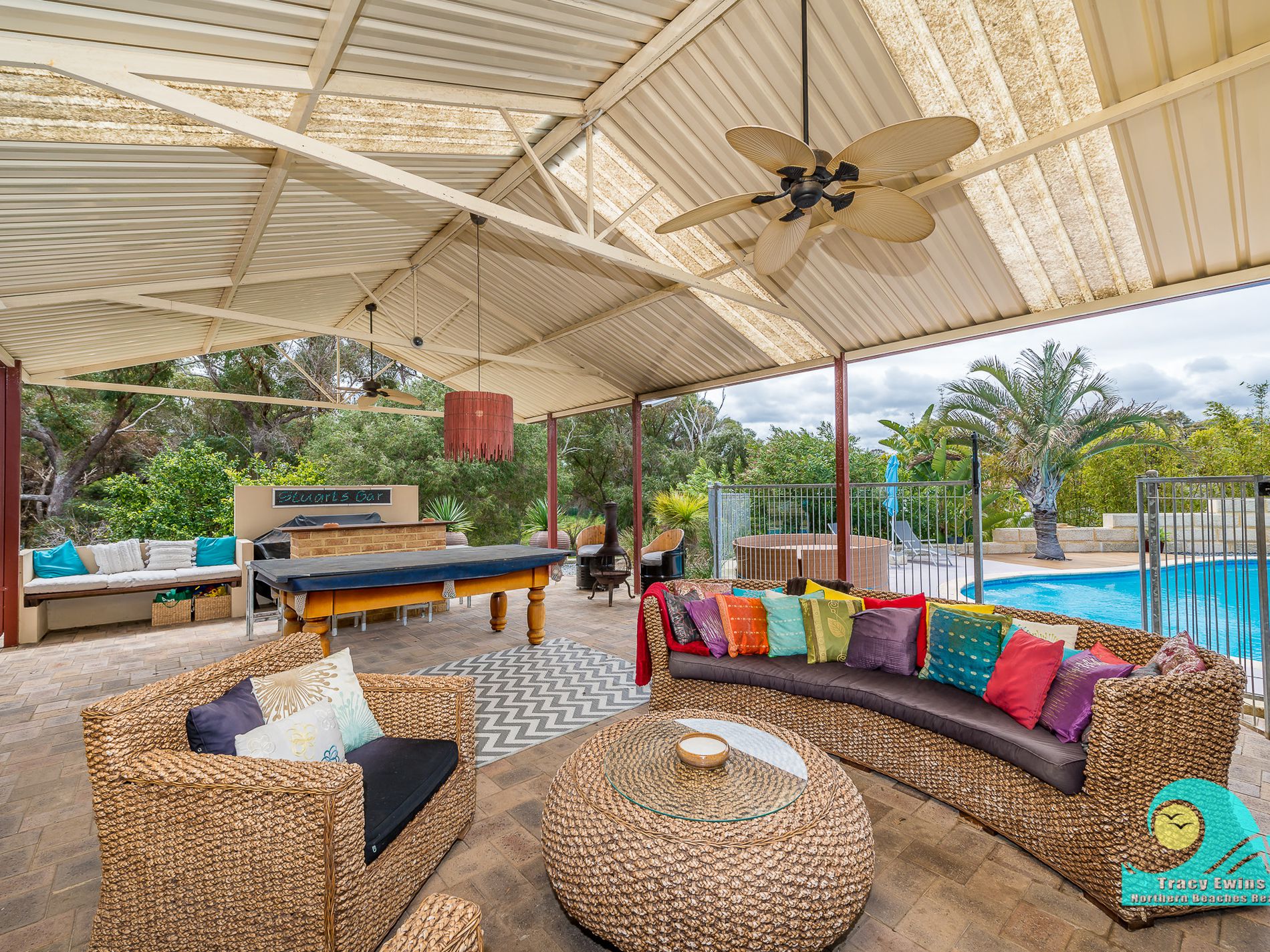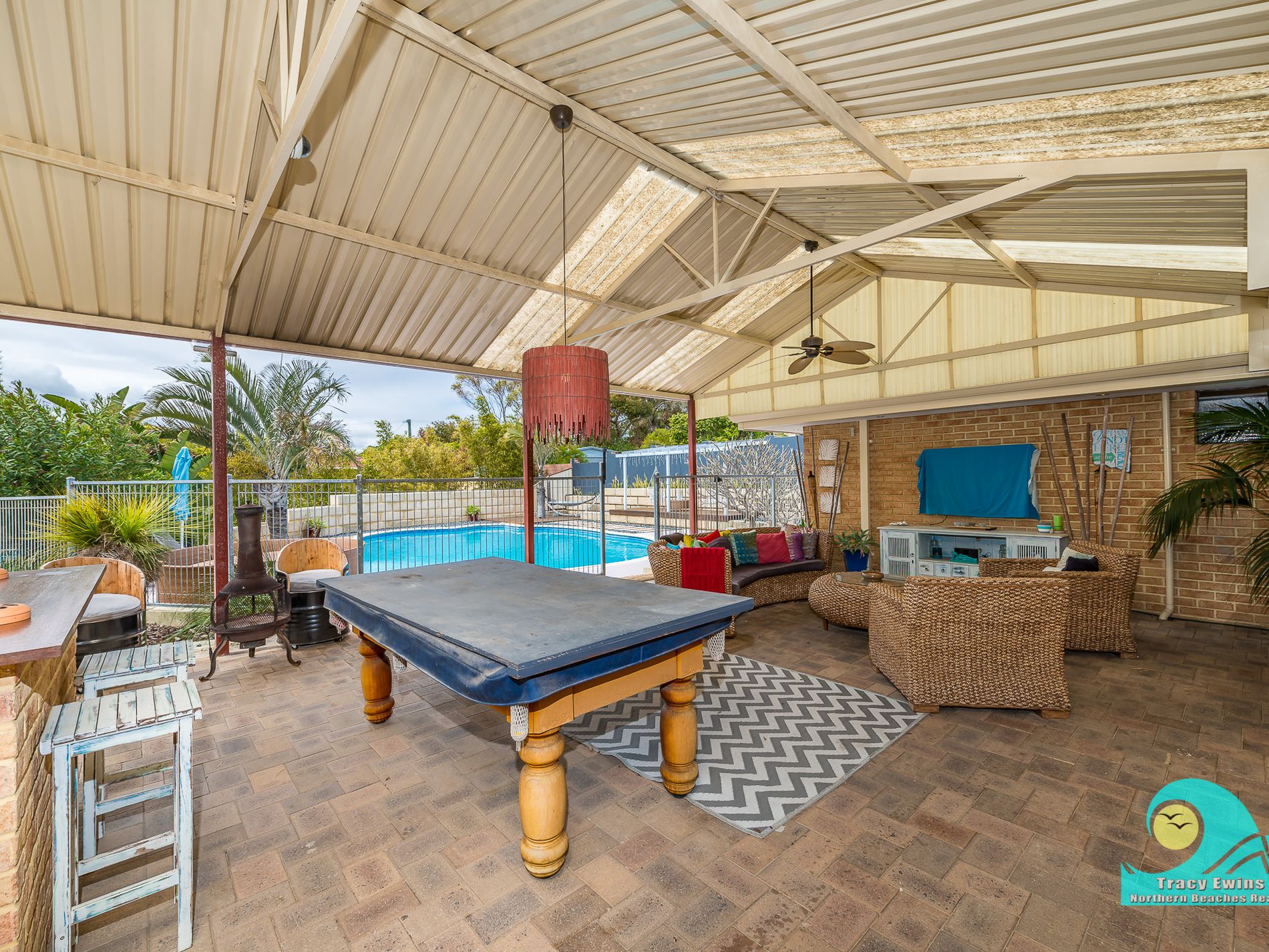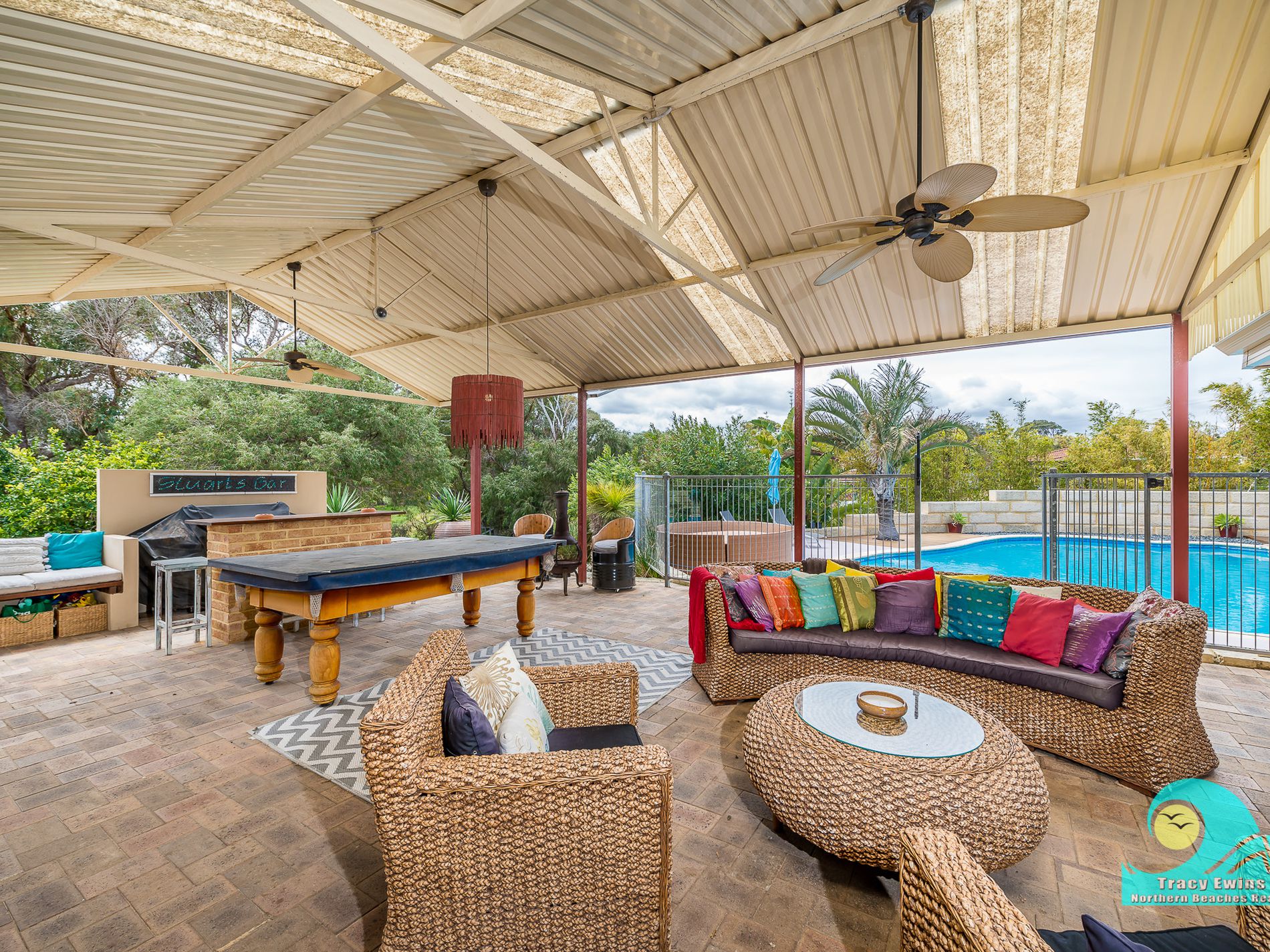 • Alfresco with feature light, big fans, tv point and built-in bar and seating.