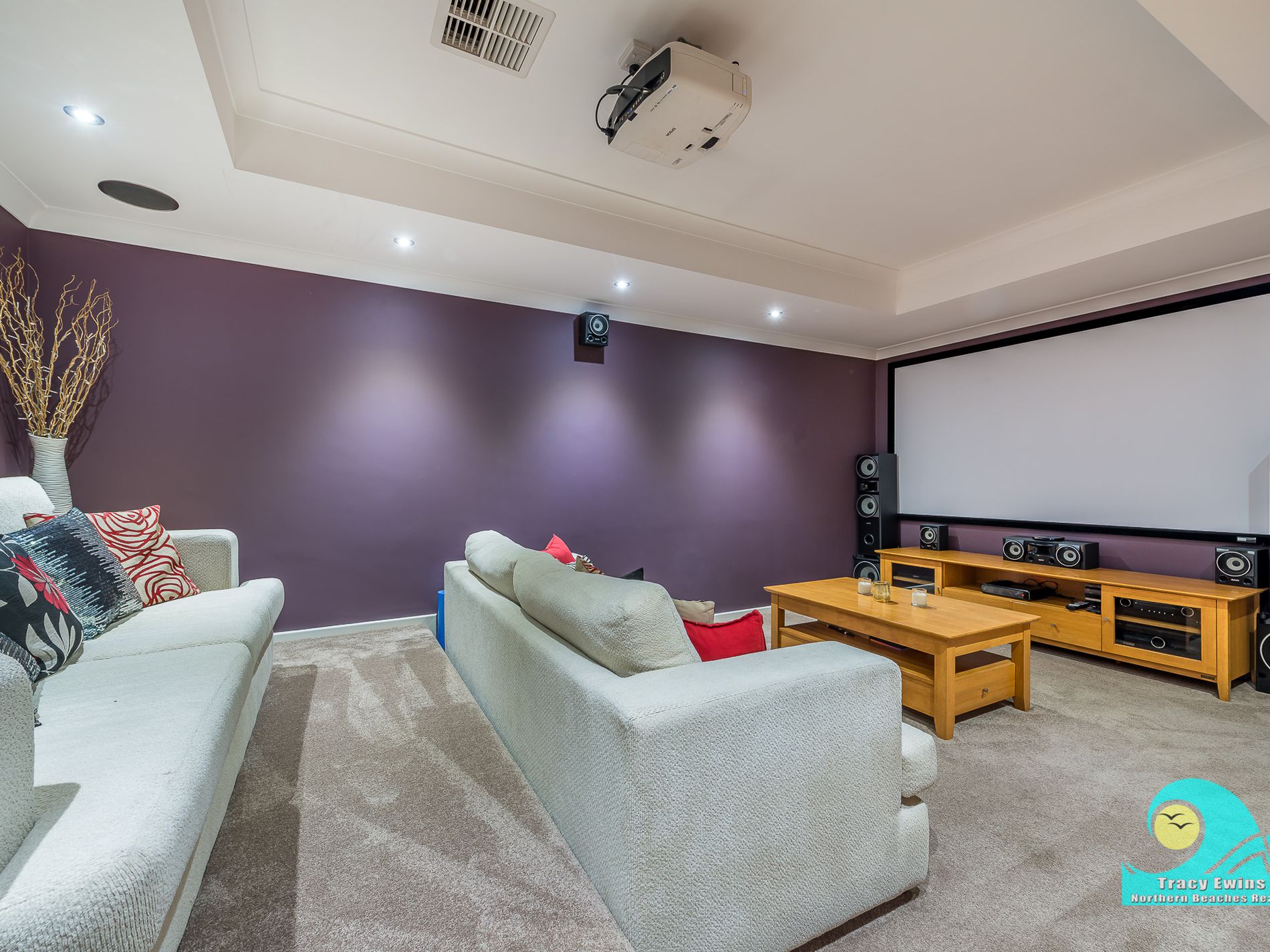 • Incredible tiered purpose-built theatre-room with projector and screen plus recessed ceiling with feature lights and speakers.