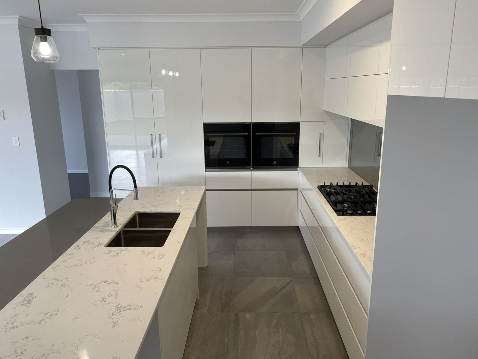 * Exceptional kitchen, bulkhead, marbled stone bench-tops with water-fall ends, beautiful cabinetry all soft-close, feature lighting and tapware, overhead cupboards, 90cm gas cook-top and rangehood with twin 60cm wall ovens, dishwasher recess plus fridge recess for a double fridge.