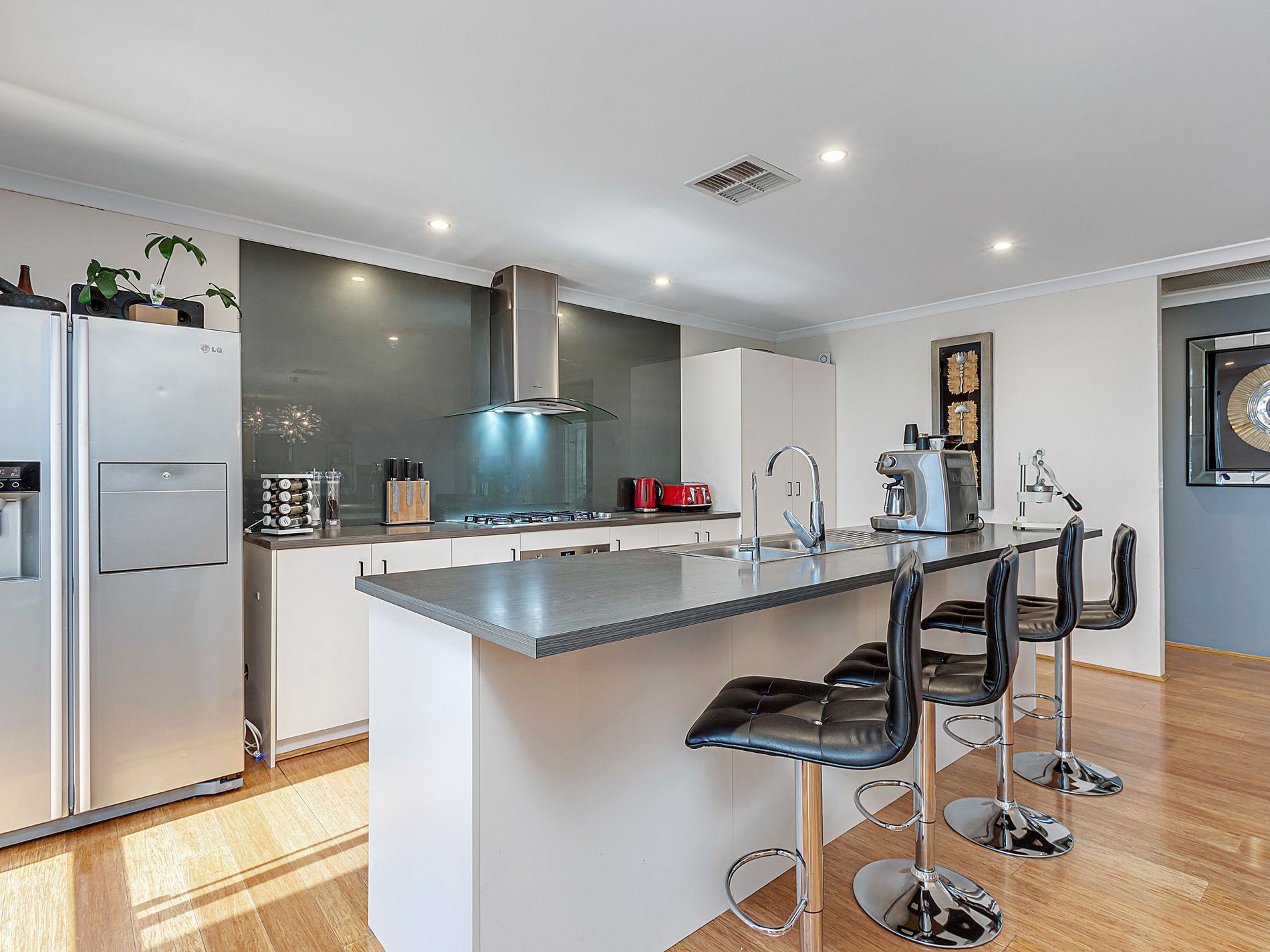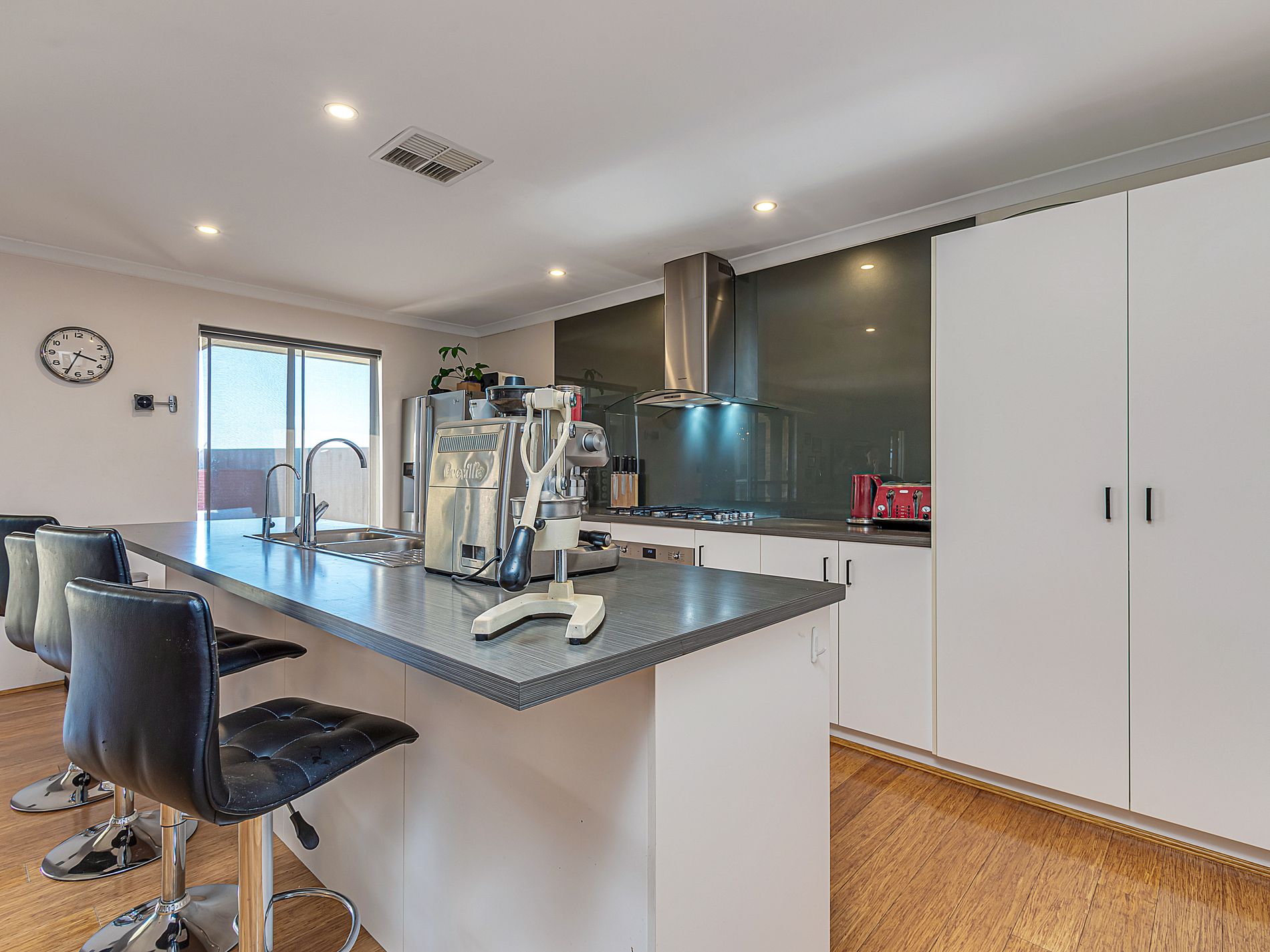 • Kitchen is well designed with plenty of bench-space and storage, plumbed recess for your big fridge/freezer, 90cm gas hob with 90cm stylish rangehood, 60cm Smeg pyrotechnic under-bench oven, huge Island/breakfast bar and all overlooking the outdoor area.